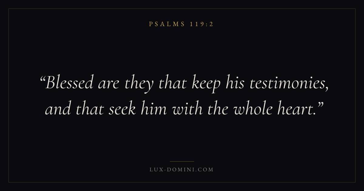 Books / Psalms / Chapter 119 / Verse 2 ← Psalms 119:1 Psalms 119:2 Psalms 119:3 → Blessed are they that keep his testimonies, and that seek him with the whole heart. Download verse card Share on Twitter Share on Facebook Pin it ✦ Key themes FaithPrayerPraiseLament Read with Hebrews 11:1Romans 10:17Matthew 6:9Luke 18:1 Related topics Bible verses about faithBible verses about prayerBible verses about thankfulness and gratitudeBible verses about grief and loss ✦ Psalms Chapter 119 verses V. 1 V. 2 V. 3 V. 4 V. 5 V. 6 V. 7 V. 8 V. 9 V. 10 V. 11 V. 12 V. 13 V. 14 V. 15 V. 16 V. 17 V. 18 V. 19 V. 20 V. 21 V. 22 V. 23 V. 24 V. 25 V. 26 V. 27 V. 28 V. 29 V. 30 V. 31 V. 32 V. 33 V. 34 V. 35 V. 36 V. 37 V. 38 V. 39 V. 40 V. 41 V. 42 V. 43 V. 44 V. 45 V. 46 V. 47 V. 48 V. 49 V. 50 V. 51 V. 52 V. 53 V. 54 V. 55 V. 56 V. 57 V. 58 V. 59 V. 60 V. 61 V. 62 V. 63 V. 64 V. 65 V. 66 V. 67 V. 68 V. 69 V. 70 V. 71 V. 72 V. 73 V. 74 V. 75 V. 76 V. 77 V. 78 V. 79 V. 80 V. 81 V. 82 V. 83 V. 84 V. 85 V. 86 V. 87 V. 88 V. 89 V. 90 V. 91 V. 92 V. 93 V. 94 V. 95 V. 96 V. 97 V. 98 V. 99 V. 100 V. 101 V. 102 V. 103 V. 104 V. 105 V. 106 V. 107 V. 108 V. 109 V. 110 V. 111 V. 112 V. 113 V. 114 V. 115 V. 116 V. 117 V. 118 V. 119 V. 120 V. 121 V. 122 V. 123 V. 124 V. 125 V. 126 V. 127 V. 128 V. 129 V. 130 V. 131 V. 132 V. 133 V. 134 V. 135 V. 136 V. 137 V. 138 V. 139 V. 140 V. 141 V. 142 V. 143 V. 144 V. 145 V. 146 V. 147 V. 148 V. 149 V. 150 V. 151 V. 152 V. 153 V. 154 V. 155 V. 156 V. 157 V. 158 V. 159 V. 160 V. 161 V. 162 V. 163 V. 164 V. 165 V. 166 V. 167 V. 168 V. 169 V. 170 V. 171 V. 172 V. 173 V. 174 V. 175 V. 176