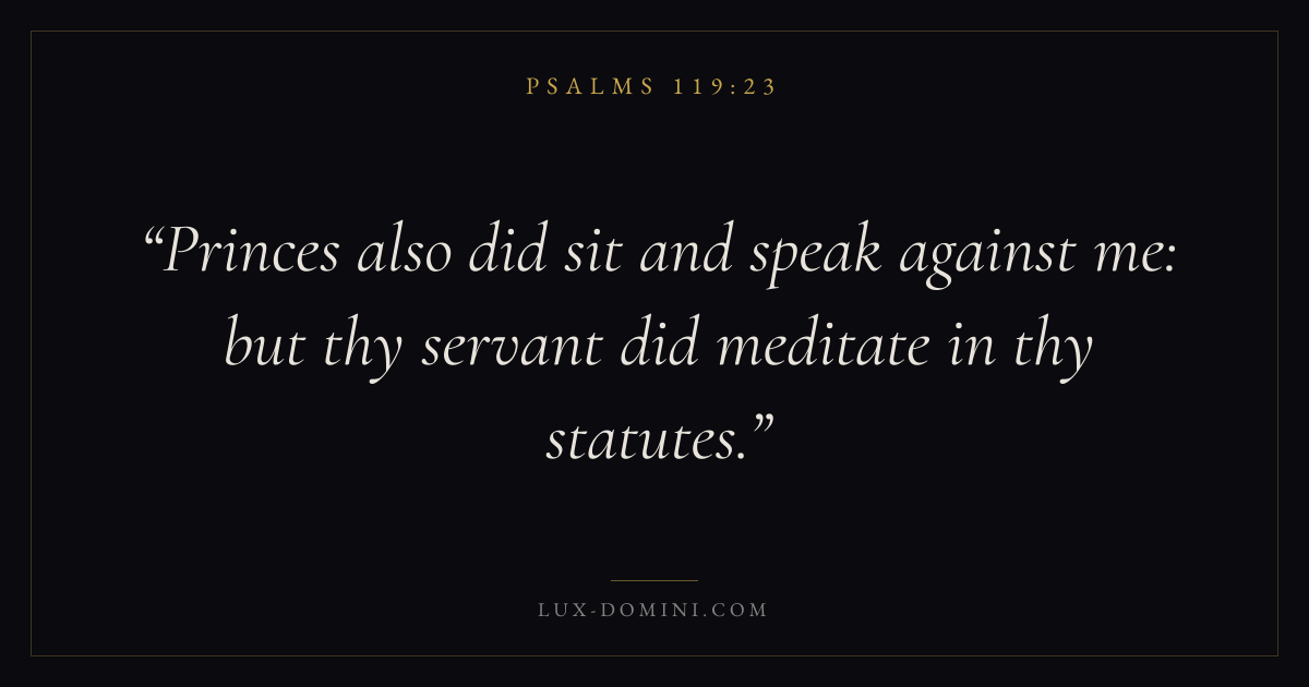 Books / Psalms / Chapter 119 / Verse 23 ← Psalms 119:22 Psalms 119:23 Psalms 119:24 → Princes also did sit and speak against me: but thy servant did meditate in thy statutes. Download verse card Share on Twitter Share on Facebook Pin it ✦ Key themes FaithPrayerJustice and mercyTruthPraise Read with Hebrews 11:1Romans 10:17Matthew 6:9Luke 18:1 Related topics Bible verses about faithBible verses about prayerBible verses about justice and mercyBible verses about truthBible verses about thankfulness and gratitude ✦ Psalms Chapter 119 verses V. 1 V. 2 V. 3 V. 4 V. 5 V. 6 V. 7 V. 8 V. 9 V. 10 V. 11 V. 12 V. 13 V. 14 V. 15 V. 16 V. 17 V. 18 V. 19 V. 20 V. 21 V. 22 V. 23 V. 24 V. 25 V. 26 V. 27 V. 28 V. 29 V. 30 V. 31 V. 32 V. 33 V. 34 V. 35 V. 36 V. 37 V. 38 V. 39 V. 40 V. 41 V. 42 V. 43 V. 44 V. 45 V. 46 V. 47 V. 48 V. 49 V. 50 V. 51 V. 52 V. 53 V. 54 V. 55 V. 56 V. 57 V. 58 V. 59 V. 60 V. 61 V. 62 V. 63 V. 64 V. 65 V. 66 V. 67 V. 68 V. 69 V. 70 V. 71 V. 72 V. 73 V. 74 V. 75 V. 76 V. 77 V. 78 V. 79 V. 80 V. 81 V. 82 V. 83 V. 84 V. 85 V. 86 V. 87 V. 88 V. 89 V. 90 V. 91 V. 92 V. 93 V. 94 V. 95 V. 96 V. 97 V. 98 V. 99 V. 100 V. 101 V. 102 V. 103 V. 104 V. 105 V. 106 V. 107 V. 108 V. 109 V. 110 V. 111 V. 112 V. 113 V. 114 V. 115 V. 116 V. 117 V. 118 V. 119 V. 120 V. 121 V. 122 V. 123 V. 124 V. 125 V. 126 V. 127 V. 128 V. 129 V. 130 V. 131 V. 132 V. 133 V. 134 V. 135 V. 136 V. 137 V. 138 V. 139 V. 140 V. 141 V. 142 V. 143 V. 144 V. 145 V. 146 V. 147 V. 148 V. 149 V. 150 V. 151 V. 152 V. 153 V. 154 V. 155 V. 156 V. 157 V. 158 V. 159 V. 160 V. 161 V. 162 V. 163 V. 164 V. 165 V. 166 V. 167 V. 168 V. 169 V. 170 V. 171 V. 172 V. 173 V. 174 V. 175 V. 176