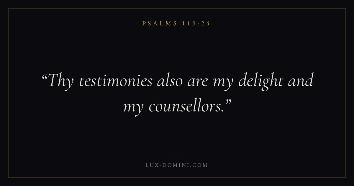 Books / Psalms / Chapter 119 / Verse 24 ← Psalms 119:23 Psalms 119:24 Psalms 119:25 → Thy testimonies also are my delight and my counsellors. Download verse card Share on Twitter Share on Facebook Pin it ✦ Key themes FaithPrayerJustice and mercyTruthPraise Read with Hebrews 11:1Romans 10:17Matthew 6:9Luke 18:1 Related topics Bible verses about faithBible verses about prayerBible verses about justice and mercyBible verses about truthBible verses about thankfulness and gratitude ✦ Psalms Chapter 119 verses V. 1 V. 2 V. 3 V. 4 V. 5 V. 6 V. 7 V. 8 V. 9 V. 10 V. 11 V. 12 V. 13 V. 14 V. 15 V. 16 V. 17 V. 18 V. 19 V. 20 V. 21 V. 22 V. 23 V. 24 V. 25 V. 26 V. 27 V. 28 V. 29 V. 30 V. 31 V. 32 V. 33 V. 34 V. 35 V. 36 V. 37 V. 38 V. 39 V. 40 V. 41 V. 42 V. 43 V. 44 V. 45 V. 46 V. 47 V. 48 V. 49 V. 50 V. 51 V. 52 V. 53 V. 54 V. 55 V. 56 V. 57 V. 58 V. 59 V. 60 V. 61 V. 62 V. 63 V. 64 V. 65 V. 66 V. 67 V. 68 V. 69 V. 70 V. 71 V. 72 V. 73 V. 74 V. 75 V. 76 V. 77 V. 78 V. 79 V. 80 V. 81 V. 82 V. 83 V. 84 V. 85 V. 86 V. 87 V. 88 V. 89 V. 90 V. 91 V. 92 V. 93 V. 94 V. 95 V. 96 V. 97 V. 98 V. 99 V. 100 V. 101 V. 102 V. 103 V. 104 V. 105 V. 106 V. 107 V. 108 V. 109 V. 110 V. 111 V. 112 V. 113 V. 114 V. 115 V. 116 V. 117 V. 118 V. 119 V. 120 V. 121 V. 122 V. 123 V. 124 V. 125 V. 126 V. 127 V. 128 V. 129 V. 130 V. 131 V. 132 V. 133 V. 134 V. 135 V. 136 V. 137 V. 138 V. 139 V. 140 V. 141 V. 142 V. 143 V. 144 V. 145 V. 146 V. 147 V. 148 V. 149 V. 150 V. 151 V. 152 V. 153 V. 154 V. 155 V. 156 V. 157 V. 158 V. 159 V. 160 V. 161 V. 162 V. 163 V. 164 V. 165 V. 166 V. 167 V. 168 V. 169 V. 170 V. 171 V. 172 V. 173 V. 174 V. 175 V. 176