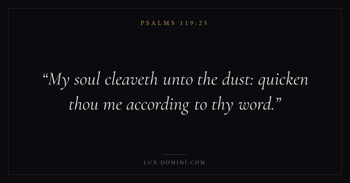 Books / Psalms / Chapter 119 / Verse 25 ← Psalms 119:24 Psalms 119:25 Psalms 119:26 → My soul cleaveth unto the dust: quicken thou me according to thy word. Download verse card Share on Twitter Share on Facebook Pin it ✦ Key themes FaithPrayerGraceTruthPraise Read with Hebrews 11:1Romans 10:17Matthew 6:9Luke 18:1 Related topics Bible verses about faithBible verses about prayerBible verses about graceBible verses about truthBible verses about thankfulness and gratitude ✦ Psalms Chapter 119 verses V. 1 V. 2 V. 3 V. 4 V. 5 V. 6 V. 7 V. 8 V. 9 V. 10 V. 11 V. 12 V. 13 V. 14 V. 15 V. 16 V. 17 V. 18 V. 19 V. 20 V. 21 V. 22 V. 23 V. 24 V. 25 V. 26 V. 27 V. 28 V. 29 V. 30 V. 31 V. 32 V. 33 V. 34 V. 35 V. 36 V. 37 V. 38 V. 39 V. 40 V. 41 V. 42 V. 43 V. 44 V. 45 V. 46 V. 47 V. 48 V. 49 V. 50 V. 51 V. 52 V. 53 V. 54 V. 55 V. 56 V. 57 V. 58 V. 59 V. 60 V. 61 V. 62 V. 63 V. 64 V. 65 V. 66 V. 67 V. 68 V. 69 V. 70 V. 71 V. 72 V. 73 V. 74 V. 75 V. 76 V. 77 V. 78 V. 79 V. 80 V. 81 V. 82 V. 83 V. 84 V. 85 V. 86 V. 87 V. 88 V. 89 V. 90 V. 91 V. 92 V. 93 V. 94 V. 95 V. 96 V. 97 V. 98 V. 99 V. 100 V. 101 V. 102 V. 103 V. 104 V. 105 V. 106 V. 107 V. 108 V. 109 V. 110 V. 111 V. 112 V. 113 V. 114 V. 115 V. 116 V. 117 V. 118 V. 119 V. 120 V. 121 V. 122 V. 123 V. 124 V. 125 V. 126 V. 127 V. 128 V. 129 V. 130 V. 131 V. 132 V. 133 V. 134 V. 135 V. 136 V. 137 V. 138 V. 139 V. 140 V. 141 V. 142 V. 143 V. 144 V. 145 V. 146 V. 147 V. 148 V. 149 V. 150 V. 151 V. 152 V. 153 V. 154 V. 155 V. 156 V. 157 V. 158 V. 159 V. 160 V. 161 V. 162 V. 163 V. 164 V. 165 V. 166 V. 167 V. 168 V. 169 V. 170 V. 171 V. 172 V. 173 V. 174 V. 175 V. 176