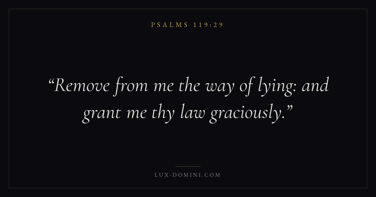 Books / Psalms / Chapter 119 / Verse 29 ← Psalms 119:28 Psalms 119:29 Psalms 119:30 → Remove from me the way of lying: and grant me thy law graciously. Download verse card Share on Twitter Share on Facebook Pin it ✦ Key themes FaithPrayerGracePraise Read with Hebrews 11:1Romans 10:17Matthew 6:9Luke 18:1 Related topics Bible verses about faithBible verses about prayerBible verses about graceBible verses about thankfulness and gratitude ✦ Psalms Chapter 119 verses V. 1 V. 2 V. 3 V. 4 V. 5 V. 6 V. 7 V. 8 V. 9 V. 10 V. 11 V. 12 V. 13 V. 14 V. 15 V. 16 V. 17 V. 18 V. 19 V. 20 V. 21 V. 22 V. 23 V. 24 V. 25 V. 26 V. 27 V. 28 V. 29 V. 30 V. 31 V. 32 V. 33 V. 34 V. 35 V. 36 V. 37 V. 38 V. 39 V. 40 V. 41 V. 42 V. 43 V. 44 V. 45 V. 46 V. 47 V. 48 V. 49 V. 50 V. 51 V. 52 V. 53 V. 54 V. 55 V. 56 V. 57 V. 58 V. 59 V. 60 V. 61 V. 62 V. 63 V. 64 V. 65 V. 66 V. 67 V. 68 V. 69 V. 70 V. 71 V. 72 V. 73 V. 74 V. 75 V. 76 V. 77 V. 78 V. 79 V. 80 V. 81 V. 82 V. 83 V. 84 V. 85 V. 86 V. 87 V. 88 V. 89 V. 90 V. 91 V. 92 V. 93 V. 94 V. 95 V. 96 V. 97 V. 98 V. 99 V. 100 V. 101 V. 102 V. 103 V. 104 V. 105 V. 106 V. 107 V. 108 V. 109 V. 110 V. 111 V. 112 V. 113 V. 114 V. 115 V. 116 V. 117 V. 118 V. 119 V. 120 V. 121 V. 122 V. 123 V. 124 V. 125 V. 126 V. 127 V. 128 V. 129 V. 130 V. 131 V. 132 V. 133 V. 134 V. 135 V. 136 V. 137 V. 138 V. 139 V. 140 V. 141 V. 142 V. 143 V. 144 V. 145 V. 146 V. 147 V. 148 V. 149 V. 150 V. 151 V. 152 V. 153 V. 154 V. 155 V. 156 V. 157 V. 158 V. 159 V. 160 V. 161 V. 162 V. 163 V. 164 V. 165 V. 166 V. 167 V. 168 V. 169 V. 170 V. 171 V. 172 V. 173 V. 174 V. 175 V. 176