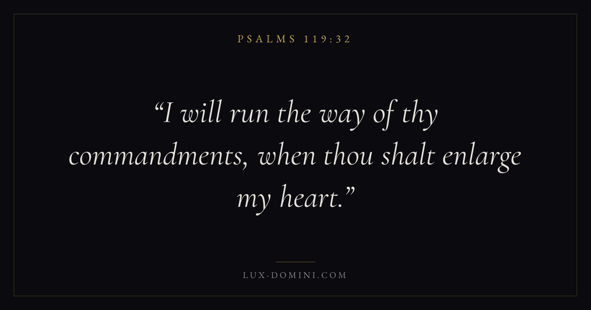 Books / Psalms / Chapter 119 / Verse 32 ← Psalms 119:31 Psalms 119:32 Psalms 119:33 → I will run the way of thy commandments, when thou shalt enlarge my heart. Download verse card Share on Twitter Share on Facebook Pin it ✦ Key themes FaithPrayerGracePraise Read with Hebrews 11:1Romans 10:17Matthew 6:9Luke 18:1 Related topics Bible verses about faithBible verses about prayerBible verses about graceBible verses about thankfulness and gratitude ✦ Psalms Chapter 119 verses V. 1 V. 2 V. 3 V. 4 V. 5 V. 6 V. 7 V. 8 V. 9 V. 10 V. 11 V. 12 V. 13 V. 14 V. 15 V. 16 V. 17 V. 18 V. 19 V. 20 V. 21 V. 22 V. 23 V. 24 V. 25 V. 26 V. 27 V. 28 V. 29 V. 30 V. 31 V. 32 V. 33 V. 34 V. 35 V. 36 V. 37 V. 38 V. 39 V. 40 V. 41 V. 42 V. 43 V. 44 V. 45 V. 46 V. 47 V. 48 V. 49 V. 50 V. 51 V. 52 V. 53 V. 54 V. 55 V. 56 V. 57 V. 58 V. 59 V. 60 V. 61 V. 62 V. 63 V. 64 V. 65 V. 66 V. 67 V. 68 V. 69 V. 70 V. 71 V. 72 V. 73 V. 74 V. 75 V. 76 V. 77 V. 78 V. 79 V. 80 V. 81 V. 82 V. 83 V. 84 V. 85 V. 86 V. 87 V. 88 V. 89 V. 90 V. 91 V. 92 V. 93 V. 94 V. 95 V. 96 V. 97 V. 98 V. 99 V. 100 V. 101 V. 102 V. 103 V. 104 V. 105 V. 106 V. 107 V. 108 V. 109 V. 110 V. 111 V. 112 V. 113 V. 114 V. 115 V. 116 V. 117 V. 118 V. 119 V. 120 V. 121 V. 122 V. 123 V. 124 V. 125 V. 126 V. 127 V. 128 V. 129 V. 130 V. 131 V. 132 V. 133 V. 134 V. 135 V. 136 V. 137 V. 138 V. 139 V. 140 V. 141 V. 142 V. 143 V. 144 V. 145 V. 146 V. 147 V. 148 V. 149 V. 150 V. 151 V. 152 V. 153 V. 154 V. 155 V. 156 V. 157 V. 158 V. 159 V. 160 V. 161 V. 162 V. 163 V. 164 V. 165 V. 166 V. 167 V. 168 V. 169 V. 170 V. 171 V. 172 V. 173 V. 174 V. 175 V. 176