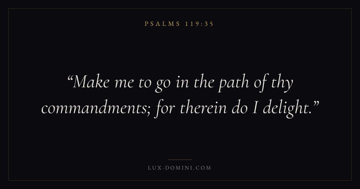 Books / Psalms / Chapter 119 / Verse 35 ← Psalms 119:34 Psalms 119:35 Psalms 119:36 → Make me to go in the path of thy commandments; for therein do I delight. Download verse card Share on Twitter Share on Facebook Pin it ✦ Key themes FaithPrayerWisdomPraise Read with Hebrews 11:1Romans 10:17Matthew 6:9Luke 18:1 Related topics Bible verses about faithBible verses about prayerBible verses about wisdomBible verses about thankfulness and gratitude ✦ Psalms Chapter 119 verses V. 1 V. 2 V. 3 V. 4 V. 5 V. 6 V. 7 V. 8 V. 9 V. 10 V. 11 V. 12 V. 13 V. 14 V. 15 V. 16 V. 17 V. 18 V. 19 V. 20 V. 21 V. 22 V. 23 V. 24 V. 25 V. 26 V. 27 V. 28 V. 29 V. 30 V. 31 V. 32 V. 33 V. 34 V. 35 V. 36 V. 37 V. 38 V. 39 V. 40 V. 41 V. 42 V. 43 V. 44 V. 45 V. 46 V. 47 V. 48 V. 49 V. 50 V. 51 V. 52 V. 53 V. 54 V. 55 V. 56 V. 57 V. 58 V. 59 V. 60 V. 61 V. 62 V. 63 V. 64 V. 65 V. 66 V. 67 V. 68 V. 69 V. 70 V. 71 V. 72 V. 73 V. 74 V. 75 V. 76 V. 77 V. 78 V. 79 V. 80 V. 81 V. 82 V. 83 V. 84 V. 85 V. 86 V. 87 V. 88 V. 89 V. 90 V. 91 V. 92 V. 93 V. 94 V. 95 V. 96 V. 97 V. 98 V. 99 V. 100 V. 101 V. 102 V. 103 V. 104 V. 105 V. 106 V. 107 V. 108 V. 109 V. 110 V. 111 V. 112 V. 113 V. 114 V. 115 V. 116 V. 117 V. 118 V. 119 V. 120 V. 121 V. 122 V. 123 V. 124 V. 125 V. 126 V. 127 V. 128 V. 129 V. 130 V. 131 V. 132 V. 133 V. 134 V. 135 V. 136 V. 137 V. 138 V. 139 V. 140 V. 141 V. 142 V. 143 V. 144 V. 145 V. 146 V. 147 V. 148 V. 149 V. 150 V. 151 V. 152 V. 153 V. 154 V. 155 V. 156 V. 157 V. 158 V. 159 V. 160 V. 161 V. 162 V. 163 V. 164 V. 165 V. 166 V. 167 V. 168 V. 169 V. 170 V. 171 V. 172 V. 173 V. 174 V. 175 V. 176