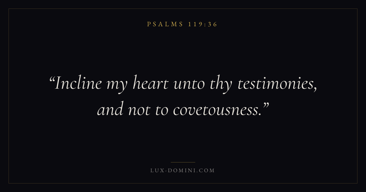 Books / Psalms / Chapter 119 / Verse 36 ← Psalms 119:35 Psalms 119:36 Psalms 119:37 → Incline my heart unto thy testimonies, and not to covetousness. Download verse card Share on Twitter Share on Facebook Pin it ✦ Key themes FaithPrayerWisdomPraise Read with Hebrews 11:1Romans 10:17Matthew 6:9Luke 18:1 Related topics Bible verses about faithBible verses about prayerBible verses about wisdomBible verses about thankfulness and gratitude ✦ Psalms Chapter 119 verses V. 1 V. 2 V. 3 V. 4 V. 5 V. 6 V. 7 V. 8 V. 9 V. 10 V. 11 V. 12 V. 13 V. 14 V. 15 V. 16 V. 17 V. 18 V. 19 V. 20 V. 21 V. 22 V. 23 V. 24 V. 25 V. 26 V. 27 V. 28 V. 29 V. 30 V. 31 V. 32 V. 33 V. 34 V. 35 V. 36 V. 37 V. 38 V. 39 V. 40 V. 41 V. 42 V. 43 V. 44 V. 45 V. 46 V. 47 V. 48 V. 49 V. 50 V. 51 V. 52 V. 53 V. 54 V. 55 V. 56 V. 57 V. 58 V. 59 V. 60 V. 61 V. 62 V. 63 V. 64 V. 65 V. 66 V. 67 V. 68 V. 69 V. 70 V. 71 V. 72 V. 73 V. 74 V. 75 V. 76 V. 77 V. 78 V. 79 V. 80 V. 81 V. 82 V. 83 V. 84 V. 85 V. 86 V. 87 V. 88 V. 89 V. 90 V. 91 V. 92 V. 93 V. 94 V. 95 V. 96 V. 97 V. 98 V. 99 V. 100 V. 101 V. 102 V. 103 V. 104 V. 105 V. 106 V. 107 V. 108 V. 109 V. 110 V. 111 V. 112 V. 113 V. 114 V. 115 V. 116 V. 117 V. 118 V. 119 V. 120 V. 121 V. 122 V. 123 V. 124 V. 125 V. 126 V. 127 V. 128 V. 129 V. 130 V. 131 V. 132 V. 133 V. 134 V. 135 V. 136 V. 137 V. 138 V. 139 V. 140 V. 141 V. 142 V. 143 V. 144 V. 145 V. 146 V. 147 V. 148 V. 149 V. 150 V. 151 V. 152 V. 153 V. 154 V. 155 V. 156 V. 157 V. 158 V. 159 V. 160 V. 161 V. 162 V. 163 V. 164 V. 165 V. 166 V. 167 V. 168 V. 169 V. 170 V. 171 V. 172 V. 173 V. 174 V. 175 V. 176