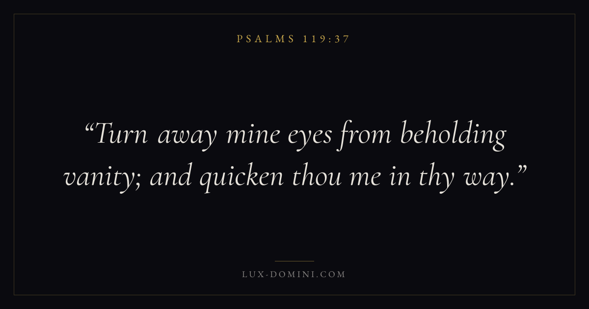 Books / Psalms / Chapter 119 / Verse 37 ← Psalms 119:36 Psalms 119:37 Psalms 119:38 → Turn away mine eyes from beholding vanity; and quicken thou me in thy way. Download verse card Share on Twitter Share on Facebook Pin it ✦ Key themes FaithPrayerWisdomPraise Read with Hebrews 11:1Romans 10:17Matthew 6:9Luke 18:1 Related topics Bible verses about faithBible verses about prayerBible verses about wisdomBible verses about thankfulness and gratitude ✦ Psalms Chapter 119 verses V. 1 V. 2 V. 3 V. 4 V. 5 V. 6 V. 7 V. 8 V. 9 V. 10 V. 11 V. 12 V. 13 V. 14 V. 15 V. 16 V. 17 V. 18 V. 19 V. 20 V. 21 V. 22 V. 23 V. 24 V. 25 V. 26 V. 27 V. 28 V. 29 V. 30 V. 31 V. 32 V. 33 V. 34 V. 35 V. 36 V. 37 V. 38 V. 39 V. 40 V. 41 V. 42 V. 43 V. 44 V. 45 V. 46 V. 47 V. 48 V. 49 V. 50 V. 51 V. 52 V. 53 V. 54 V. 55 V. 56 V. 57 V. 58 V. 59 V. 60 V. 61 V. 62 V. 63 V. 64 V. 65 V. 66 V. 67 V. 68 V. 69 V. 70 V. 71 V. 72 V. 73 V. 74 V. 75 V. 76 V. 77 V. 78 V. 79 V. 80 V. 81 V. 82 V. 83 V. 84 V. 85 V. 86 V. 87 V. 88 V. 89 V. 90 V. 91 V. 92 V. 93 V. 94 V. 95 V. 96 V. 97 V. 98 V. 99 V. 100 V. 101 V. 102 V. 103 V. 104 V. 105 V. 106 V. 107 V. 108 V. 109 V. 110 V. 111 V. 112 V. 113 V. 114 V. 115 V. 116 V. 117 V. 118 V. 119 V. 120 V. 121 V. 122 V. 123 V. 124 V. 125 V. 126 V. 127 V. 128 V. 129 V. 130 V. 131 V. 132 V. 133 V. 134 V. 135 V. 136 V. 137 V. 138 V. 139 V. 140 V. 141 V. 142 V. 143 V. 144 V. 145 V. 146 V. 147 V. 148 V. 149 V. 150 V. 151 V. 152 V. 153 V. 154 V. 155 V. 156 V. 157 V. 158 V. 159 V. 160 V. 161 V. 162 V. 163 V. 164 V. 165 V. 166 V. 167 V. 168 V. 169 V. 170 V. 171 V. 172 V. 173 V. 174 V. 175 V. 176