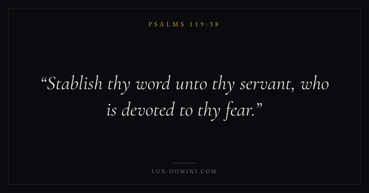 Books / Psalms / Chapter 119 / Verse 38 ← Psalms 119:37 Psalms 119:38 Psalms 119:39 → Stablish thy word unto thy servant, who is devoted to thy fear. Download verse card Share on Twitter Share on Facebook Pin it ✦ Key themes FaithAnxiety and fearPrayerWisdomPraise Read with Hebrews 11:1Romans 10:17Philippians 4:6Isaiah 41:10 Related topics Bible verses about faithBible verses about anxiety and fearBible verses about prayerBible verses about wisdomBible verses about thankfulness and gratitude ✦ Psalms Chapter 119 verses V. 1 V. 2 V. 3 V. 4 V. 5 V. 6 V. 7 V. 8 V. 9 V. 10 V. 11 V. 12 V. 13 V. 14 V. 15 V. 16 V. 17 V. 18 V. 19 V. 20 V. 21 V. 22 V. 23 V. 24 V. 25 V. 26 V. 27 V. 28 V. 29 V. 30 V. 31 V. 32 V. 33 V. 34 V. 35 V. 36 V. 37 V. 38 V. 39 V. 40 V. 41 V. 42 V. 43 V. 44 V. 45 V. 46 V. 47 V. 48 V. 49 V. 50 V. 51 V. 52 V. 53 V. 54 V. 55 V. 56 V. 57 V. 58 V. 59 V. 60 V. 61 V. 62 V. 63 V. 64 V. 65 V. 66 V. 67 V. 68 V. 69 V. 70 V. 71 V. 72 V. 73 V. 74 V. 75 V. 76 V. 77 V. 78 V. 79 V. 80 V. 81 V. 82 V. 83 V. 84 V. 85 V. 86 V. 87 V. 88 V. 89 V. 90 V. 91 V. 92 V. 93 V. 94 V. 95 V. 96 V. 97 V. 98 V. 99 V. 100 V. 101 V. 102 V. 103 V. 104 V. 105 V. 106 V. 107 V. 108 V. 109 V. 110 V. 111 V. 112 V. 113 V. 114 V. 115 V. 116 V. 117 V. 118 V. 119 V. 120 V. 121 V. 122 V. 123 V. 124 V. 125 V. 126 V. 127 V. 128 V. 129 V. 130 V. 131 V. 132 V. 133 V. 134 V. 135 V. 136 V. 137 V. 138 V. 139 V. 140 V. 141 V. 142 V. 143 V. 144 V. 145 V. 146 V. 147 V. 148 V. 149 V. 150 V. 151 V. 152 V. 153 V. 154 V. 155 V. 156 V. 157 V. 158 V. 159 V. 160 V. 161 V. 162 V. 163 V. 164 V. 165 V. 166 V. 167 V. 168 V. 169 V. 170 V. 171 V. 172 V. 173 V. 174 V. 175 V. 176