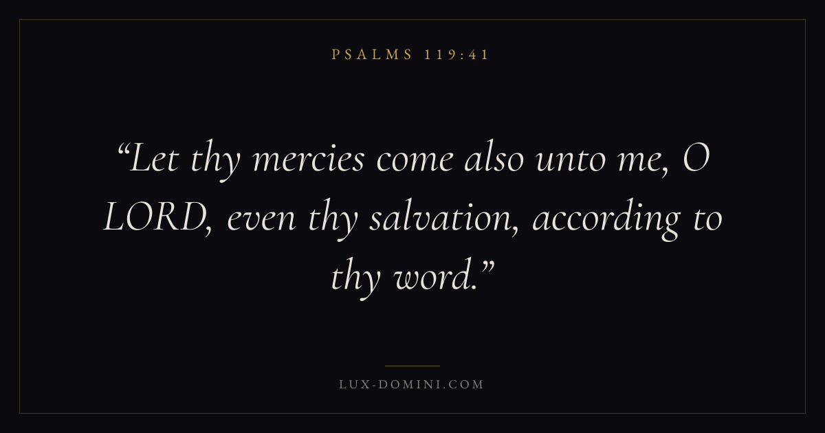 Books / Psalms / Chapter 119 / Verse 41 ← Psalms 119:40 Psalms 119:41 Psalms 119:42 → Let thy mercies come also unto me, O LORD, even thy salvation, according to thy word. Download verse card Share on Twitter Share on Facebook Pin it ✦ Key themes FaithPrayerSalvationTruthPraise Read with Hebrews 11:1Romans 10:17Matthew 6:9Luke 18:1 Related topics Bible verses about faithBible verses about prayerBible verses about salvationBible verses about truthBible verses about thankfulness and gratitude ✦ Psalms Chapter 119 verses V. 1 V. 2 V. 3 V. 4 V. 5 V. 6 V. 7 V. 8 V. 9 V. 10 V. 11 V. 12 V. 13 V. 14 V. 15 V. 16 V. 17 V. 18 V. 19 V. 20 V. 21 V. 22 V. 23 V. 24 V. 25 V. 26 V. 27 V. 28 V. 29 V. 30 V. 31 V. 32 V. 33 V. 34 V. 35 V. 36 V. 37 V. 38 V. 39 V. 40 V. 41 V. 42 V. 43 V. 44 V. 45 V. 46 V. 47 V. 48 V. 49 V. 50 V. 51 V. 52 V. 53 V. 54 V. 55 V. 56 V. 57 V. 58 V. 59 V. 60 V. 61 V. 62 V. 63 V. 64 V. 65 V. 66 V. 67 V. 68 V. 69 V. 70 V. 71 V. 72 V. 73 V. 74 V. 75 V. 76 V. 77 V. 78 V. 79 V. 80 V. 81 V. 82 V. 83 V. 84 V. 85 V. 86 V. 87 V. 88 V. 89 V. 90 V. 91 V. 92 V. 93 V. 94 V. 95 V. 96 V. 97 V. 98 V. 99 V. 100 V. 101 V. 102 V. 103 V. 104 V. 105 V. 106 V. 107 V. 108 V. 109 V. 110 V. 111 V. 112 V. 113 V. 114 V. 115 V. 116 V. 117 V. 118 V. 119 V. 120 V. 121 V. 122 V. 123 V. 124 V. 125 V. 126 V. 127 V. 128 V. 129 V. 130 V. 131 V. 132 V. 133 V. 134 V. 135 V. 136 V. 137 V. 138 V. 139 V. 140 V. 141 V. 142 V. 143 V. 144 V. 145 V. 146 V. 147 V. 148 V. 149 V. 150 V. 151 V. 152 V. 153 V. 154 V. 155 V. 156 V. 157 V. 158 V. 159 V. 160 V. 161 V. 162 V. 163 V. 164 V. 165 V. 166 V. 167 V. 168 V. 169 V. 170 V. 171 V. 172 V. 173 V. 174 V. 175 V. 176