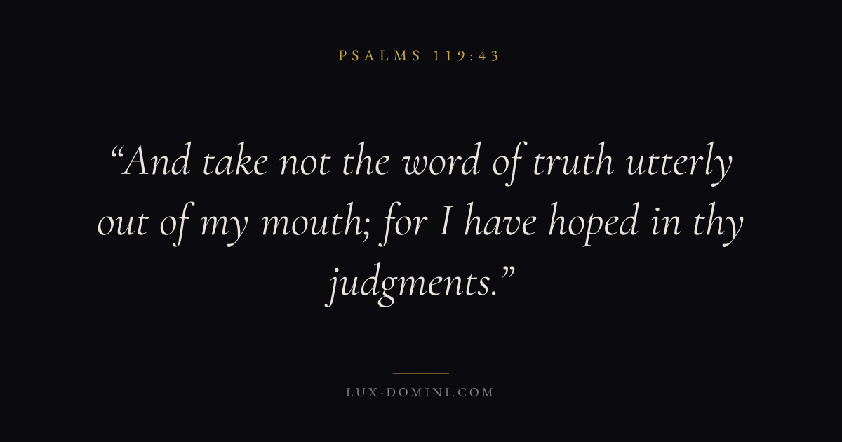 Books / Psalms / Chapter 119 / Verse 43 ← Psalms 119:42 Psalms 119:43 Psalms 119:44 → And take not the word of truth utterly out of my mouth; for I have hoped in thy judgments. Download verse card Share on Twitter Share on Facebook Pin it ✦ Key themes FaithPrayerSalvationTruthPraise Read with Hebrews 11:1Romans 10:17Matthew 6:9Luke 18:1 Related topics Bible verses about faithBible verses about prayerBible verses about salvationBible verses about truthBible verses about thankfulness and gratitude ✦ Psalms Chapter 119 verses V. 1 V. 2 V. 3 V. 4 V. 5 V. 6 V. 7 V. 8 V. 9 V. 10 V. 11 V. 12 V. 13 V. 14 V. 15 V. 16 V. 17 V. 18 V. 19 V. 20 V. 21 V. 22 V. 23 V. 24 V. 25 V. 26 V. 27 V. 28 V. 29 V. 30 V. 31 V. 32 V. 33 V. 34 V. 35 V. 36 V. 37 V. 38 V. 39 V. 40 V. 41 V. 42 V. 43 V. 44 V. 45 V. 46 V. 47 V. 48 V. 49 V. 50 V. 51 V. 52 V. 53 V. 54 V. 55 V. 56 V. 57 V. 58 V. 59 V. 60 V. 61 V. 62 V. 63 V. 64 V. 65 V. 66 V. 67 V. 68 V. 69 V. 70 V. 71 V. 72 V. 73 V. 74 V. 75 V. 76 V. 77 V. 78 V. 79 V. 80 V. 81 V. 82 V. 83 V. 84 V. 85 V. 86 V. 87 V. 88 V. 89 V. 90 V. 91 V. 92 V. 93 V. 94 V. 95 V. 96 V. 97 V. 98 V. 99 V. 100 V. 101 V. 102 V. 103 V. 104 V. 105 V. 106 V. 107 V. 108 V. 109 V. 110 V. 111 V. 112 V. 113 V. 114 V. 115 V. 116 V. 117 V. 118 V. 119 V. 120 V. 121 V. 122 V. 123 V. 124 V. 125 V. 126 V. 127 V. 128 V. 129 V. 130 V. 131 V. 132 V. 133 V. 134 V. 135 V. 136 V. 137 V. 138 V. 139 V. 140 V. 141 V. 142 V. 143 V. 144 V. 145 V. 146 V. 147 V. 148 V. 149 V. 150 V. 151 V. 152 V. 153 V. 154 V. 155 V. 156 V. 157 V. 158 V. 159 V. 160 V. 161 V. 162 V. 163 V. 164 V. 165 V. 166 V. 167 V. 168 V. 169 V. 170 V. 171 V. 172 V. 173 V. 174 V. 175 V. 176
