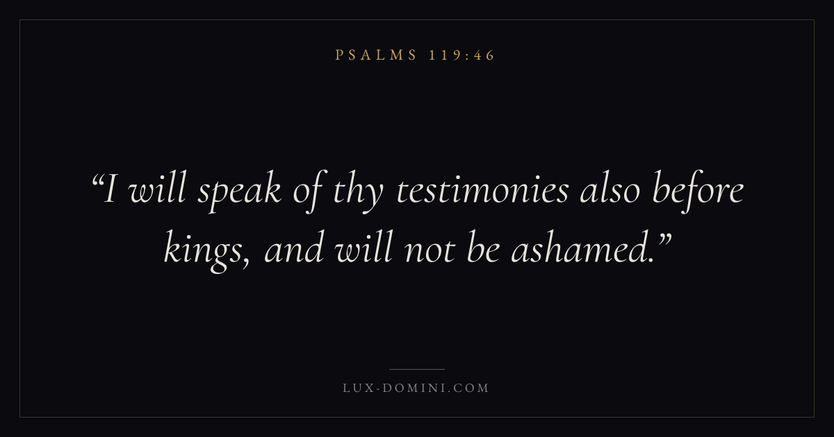 Books / Psalms / Chapter 119 / Verse 46 ← Psalms 119:45 Psalms 119:46 Psalms 119:47 → I will speak of thy testimonies also before kings, and will not be ashamed. Download verse card Share on Twitter Share on Facebook Pin it ✦ Key themes FaithPrayerSalvationTruthPraise Read with Hebrews 11:1Romans 10:17Matthew 6:9Luke 18:1 Related topics Bible verses about faithBible verses about prayerBible verses about salvationBible verses about truthBible verses about thankfulness and gratitude ✦ Psalms Chapter 119 verses V. 1 V. 2 V. 3 V. 4 V. 5 V. 6 V. 7 V. 8 V. 9 V. 10 V. 11 V. 12 V. 13 V. 14 V. 15 V. 16 V. 17 V. 18 V. 19 V. 20 V. 21 V. 22 V. 23 V. 24 V. 25 V. 26 V. 27 V. 28 V. 29 V. 30 V. 31 V. 32 V. 33 V. 34 V. 35 V. 36 V. 37 V. 38 V. 39 V. 40 V. 41 V. 42 V. 43 V. 44 V. 45 V. 46 V. 47 V. 48 V. 49 V. 50 V. 51 V. 52 V. 53 V. 54 V. 55 V. 56 V. 57 V. 58 V. 59 V. 60 V. 61 V. 62 V. 63 V. 64 V. 65 V. 66 V. 67 V. 68 V. 69 V. 70 V. 71 V. 72 V. 73 V. 74 V. 75 V. 76 V. 77 V. 78 V. 79 V. 80 V. 81 V. 82 V. 83 V. 84 V. 85 V. 86 V. 87 V. 88 V. 89 V. 90 V. 91 V. 92 V. 93 V. 94 V. 95 V. 96 V. 97 V. 98 V. 99 V. 100 V. 101 V. 102 V. 103 V. 104 V. 105 V. 106 V. 107 V. 108 V. 109 V. 110 V. 111 V. 112 V. 113 V. 114 V. 115 V. 116 V. 117 V. 118 V. 119 V. 120 V. 121 V. 122 V. 123 V. 124 V. 125 V. 126 V. 127 V. 128 V. 129 V. 130 V. 131 V. 132 V. 133 V. 134 V. 135 V. 136 V. 137 V. 138 V. 139 V. 140 V. 141 V. 142 V. 143 V. 144 V. 145 V. 146 V. 147 V. 148 V. 149 V. 150 V. 151 V. 152 V. 153 V. 154 V. 155 V. 156 V. 157 V. 158 V. 159 V. 160 V. 161 V. 162 V. 163 V. 164 V. 165 V. 166 V. 167 V. 168 V. 169 V. 170 V. 171 V. 172 V. 173 V. 174 V. 175 V. 176