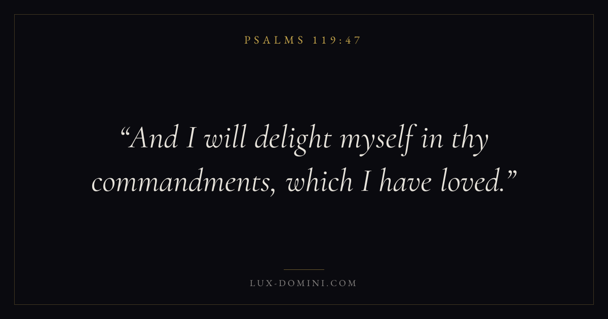 Books / Psalms / Chapter 119 / Verse 47 ← Psalms 119:46 Psalms 119:47 Psalms 119:48 → And I will delight myself in thy commandments, which I have loved. Download verse card Share on Twitter Share on Facebook Pin it ✦ Key themes FaithPrayerSalvationTruthPraise Read with Hebrews 11:1Romans 10:17Matthew 6:9Luke 18:1 Related topics Bible verses about faithBible verses about prayerBible verses about salvationBible verses about truthBible verses about thankfulness and gratitude ✦ Psalms Chapter 119 verses V. 1 V. 2 V. 3 V. 4 V. 5 V. 6 V. 7 V. 8 V. 9 V. 10 V. 11 V. 12 V. 13 V. 14 V. 15 V. 16 V. 17 V. 18 V. 19 V. 20 V. 21 V. 22 V. 23 V. 24 V. 25 V. 26 V. 27 V. 28 V. 29 V. 30 V. 31 V. 32 V. 33 V. 34 V. 35 V. 36 V. 37 V. 38 V. 39 V. 40 V. 41 V. 42 V. 43 V. 44 V. 45 V. 46 V. 47 V. 48 V. 49 V. 50 V. 51 V. 52 V. 53 V. 54 V. 55 V. 56 V. 57 V. 58 V. 59 V. 60 V. 61 V. 62 V. 63 V. 64 V. 65 V. 66 V. 67 V. 68 V. 69 V. 70 V. 71 V. 72 V. 73 V. 74 V. 75 V. 76 V. 77 V. 78 V. 79 V. 80 V. 81 V. 82 V. 83 V. 84 V. 85 V. 86 V. 87 V. 88 V. 89 V. 90 V. 91 V. 92 V. 93 V. 94 V. 95 V. 96 V. 97 V. 98 V. 99 V. 100 V. 101 V. 102 V. 103 V. 104 V. 105 V. 106 V. 107 V. 108 V. 109 V. 110 V. 111 V. 112 V. 113 V. 114 V. 115 V. 116 V. 117 V. 118 V. 119 V. 120 V. 121 V. 122 V. 123 V. 124 V. 125 V. 126 V. 127 V. 128 V. 129 V. 130 V. 131 V. 132 V. 133 V. 134 V. 135 V. 136 V. 137 V. 138 V. 139 V. 140 V. 141 V. 142 V. 143 V. 144 V. 145 V. 146 V. 147 V. 148 V. 149 V. 150 V. 151 V. 152 V. 153 V. 154 V. 155 V. 156 V. 157 V. 158 V. 159 V. 160 V. 161 V. 162 V. 163 V. 164 V. 165 V. 166 V. 167 V. 168 V. 169 V. 170 V. 171 V. 172 V. 173 V. 174 V. 175 V. 176