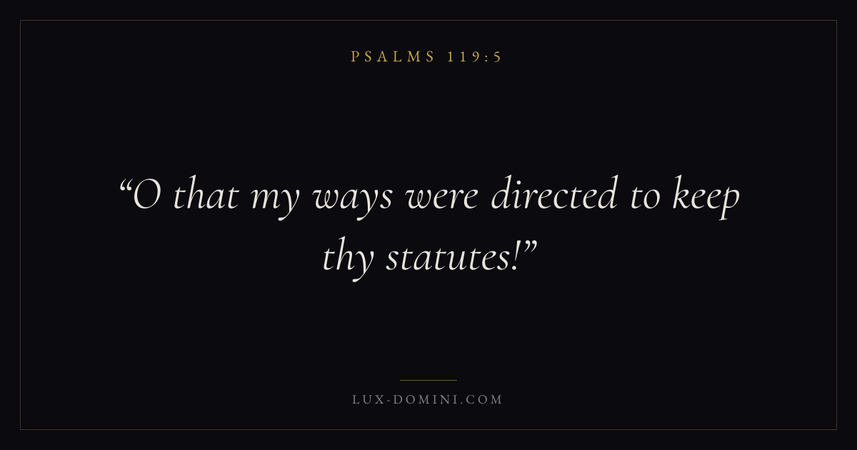 Books / Psalms / Chapter 119 / Verse 5 ← Psalms 119:4 Psalms 119:5 Psalms 119:6 → O that my ways were directed to keep thy statutes! Download verse card Share on Twitter Share on Facebook Pin it ✦ Key themes FaithPrayerPraiseLament Read with Hebrews 11:1Romans 10:17Matthew 6:9Luke 18:1 Related topics Bible verses about faithBible verses about prayerBible verses about thankfulness and gratitudeBible verses about grief and loss ✦ Psalms Chapter 119 verses V. 1 V. 2 V. 3 V. 4 V. 5 V. 6 V. 7 V. 8 V. 9 V. 10 V. 11 V. 12 V. 13 V. 14 V. 15 V. 16 V. 17 V. 18 V. 19 V. 20 V. 21 V. 22 V. 23 V. 24 V. 25 V. 26 V. 27 V. 28 V. 29 V. 30 V. 31 V. 32 V. 33 V. 34 V. 35 V. 36 V. 37 V. 38 V. 39 V. 40 V. 41 V. 42 V. 43 V. 44 V. 45 V. 46 V. 47 V. 48 V. 49 V. 50 V. 51 V. 52 V. 53 V. 54 V. 55 V. 56 V. 57 V. 58 V. 59 V. 60 V. 61 V. 62 V. 63 V. 64 V. 65 V. 66 V. 67 V. 68 V. 69 V. 70 V. 71 V. 72 V. 73 V. 74 V. 75 V. 76 V. 77 V. 78 V. 79 V. 80 V. 81 V. 82 V. 83 V. 84 V. 85 V. 86 V. 87 V. 88 V. 89 V. 90 V. 91 V. 92 V. 93 V. 94 V. 95 V. 96 V. 97 V. 98 V. 99 V. 100 V. 101 V. 102 V. 103 V. 104 V. 105 V. 106 V. 107 V. 108 V. 109 V. 110 V. 111 V. 112 V. 113 V. 114 V. 115 V. 116 V. 117 V. 118 V. 119 V. 120 V. 121 V. 122 V. 123 V. 124 V. 125 V. 126 V. 127 V. 128 V. 129 V. 130 V. 131 V. 132 V. 133 V. 134 V. 135 V. 136 V. 137 V. 138 V. 139 V. 140 V. 141 V. 142 V. 143 V. 144 V. 145 V. 146 V. 147 V. 148 V. 149 V. 150 V. 151 V. 152 V. 153 V. 154 V. 155 V. 156 V. 157 V. 158 V. 159 V. 160 V. 161 V. 162 V. 163 V. 164 V. 165 V. 166 V. 167 V. 168 V. 169 V. 170 V. 171 V. 172 V. 173 V. 174 V. 175 V. 176