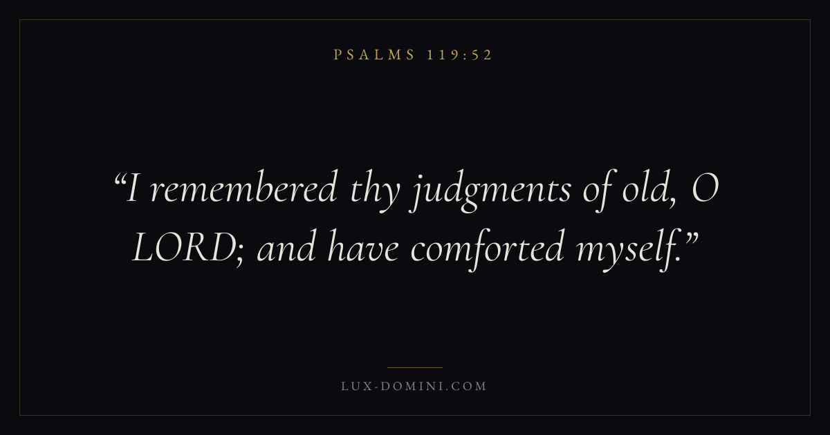 Books / Psalms / Chapter 119 / Verse 52 ← Psalms 119:51 Psalms 119:52 Psalms 119:53 → I remembered thy judgments of old, O LORD; and have comforted myself. Download verse card Share on Twitter Share on Facebook Pin it ✦ Key themes FaithPrayerHumilityPraise Read with Hebrews 11:1Romans 10:17Matthew 6:9Luke 18:1 Related topics Bible verses about faithBible verses about prayerBible verses about humilityBible verses about thankfulness and gratitude ✦ Psalms Chapter 119 verses V. 1 V. 2 V. 3 V. 4 V. 5 V. 6 V. 7 V. 8 V. 9 V. 10 V. 11 V. 12 V. 13 V. 14 V. 15 V. 16 V. 17 V. 18 V. 19 V. 20 V. 21 V. 22 V. 23 V. 24 V. 25 V. 26 V. 27 V. 28 V. 29 V. 30 V. 31 V. 32 V. 33 V. 34 V. 35 V. 36 V. 37 V. 38 V. 39 V. 40 V. 41 V. 42 V. 43 V. 44 V. 45 V. 46 V. 47 V. 48 V. 49 V. 50 V. 51 V. 52 V. 53 V. 54 V. 55 V. 56 V. 57 V. 58 V. 59 V. 60 V. 61 V. 62 V. 63 V. 64 V. 65 V. 66 V. 67 V. 68 V. 69 V. 70 V. 71 V. 72 V. 73 V. 74 V. 75 V. 76 V. 77 V. 78 V. 79 V. 80 V. 81 V. 82 V. 83 V. 84 V. 85 V. 86 V. 87 V. 88 V. 89 V. 90 V. 91 V. 92 V. 93 V. 94 V. 95 V. 96 V. 97 V. 98 V. 99 V. 100 V. 101 V. 102 V. 103 V. 104 V. 105 V. 106 V. 107 V. 108 V. 109 V. 110 V. 111 V. 112 V. 113 V. 114 V. 115 V. 116 V. 117 V. 118 V. 119 V. 120 V. 121 V. 122 V. 123 V. 124 V. 125 V. 126 V. 127 V. 128 V. 129 V. 130 V. 131 V. 132 V. 133 V. 134 V. 135 V. 136 V. 137 V. 138 V. 139 V. 140 V. 141 V. 142 V. 143 V. 144 V. 145 V. 146 V. 147 V. 148 V. 149 V. 150 V. 151 V. 152 V. 153 V. 154 V. 155 V. 156 V. 157 V. 158 V. 159 V. 160 V. 161 V. 162 V. 163 V. 164 V. 165 V. 166 V. 167 V. 168 V. 169 V. 170 V. 171 V. 172 V. 173 V. 174 V. 175 V. 176