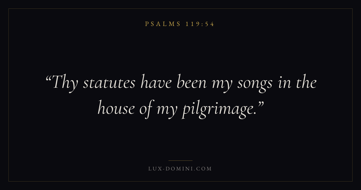 Books / Psalms / Chapter 119 / Verse 54 ← Psalms 119:53 Psalms 119:54 Psalms 119:55 → Thy statutes have been my songs in the house of my pilgrimage. Download verse card Share on Twitter Share on Facebook Pin it ✦ Key themes FaithPrayerHumilityPraise Read with Hebrews 11:1Romans 10:17Matthew 6:9Luke 18:1 Related topics Bible verses about faithBible verses about prayerBible verses about humilityBible verses about thankfulness and gratitude ✦ Psalms Chapter 119 verses V. 1 V. 2 V. 3 V. 4 V. 5 V. 6 V. 7 V. 8 V. 9 V. 10 V. 11 V. 12 V. 13 V. 14 V. 15 V. 16 V. 17 V. 18 V. 19 V. 20 V. 21 V. 22 V. 23 V. 24 V. 25 V. 26 V. 27 V. 28 V. 29 V. 30 V. 31 V. 32 V. 33 V. 34 V. 35 V. 36 V. 37 V. 38 V. 39 V. 40 V. 41 V. 42 V. 43 V. 44 V. 45 V. 46 V. 47 V. 48 V. 49 V. 50 V. 51 V. 52 V. 53 V. 54 V. 55 V. 56 V. 57 V. 58 V. 59 V. 60 V. 61 V. 62 V. 63 V. 64 V. 65 V. 66 V. 67 V. 68 V. 69 V. 70 V. 71 V. 72 V. 73 V. 74 V. 75 V. 76 V. 77 V. 78 V. 79 V. 80 V. 81 V. 82 V. 83 V. 84 V. 85 V. 86 V. 87 V. 88 V. 89 V. 90 V. 91 V. 92 V. 93 V. 94 V. 95 V. 96 V. 97 V. 98 V. 99 V. 100 V. 101 V. 102 V. 103 V. 104 V. 105 V. 106 V. 107 V. 108 V. 109 V. 110 V. 111 V. 112 V. 113 V. 114 V. 115 V. 116 V. 117 V. 118 V. 119 V. 120 V. 121 V. 122 V. 123 V. 124 V. 125 V. 126 V. 127 V. 128 V. 129 V. 130 V. 131 V. 132 V. 133 V. 134 V. 135 V. 136 V. 137 V. 138 V. 139 V. 140 V. 141 V. 142 V. 143 V. 144 V. 145 V. 146 V. 147 V. 148 V. 149 V. 150 V. 151 V. 152 V. 153 V. 154 V. 155 V. 156 V. 157 V. 158 V. 159 V. 160 V. 161 V. 162 V. 163 V. 164 V. 165 V. 166 V. 167 V. 168 V. 169 V. 170 V. 171 V. 172 V. 173 V. 174 V. 175 V. 176