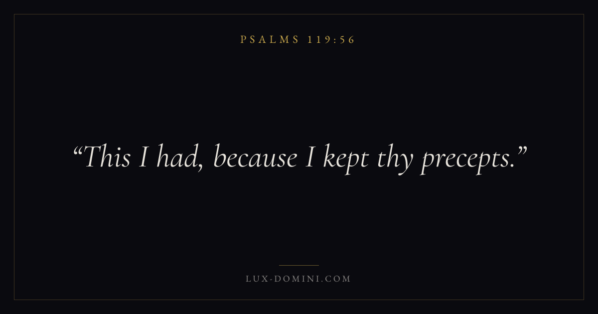 Books / Psalms / Chapter 119 / Verse 56 ← Psalms 119:55 Psalms 119:56 Psalms 119:57 → This I had, because I kept thy precepts. Download verse card Share on Twitter Share on Facebook Pin it ✦ Key themes FaithPrayerHumilityPraise Read with Hebrews 11:1Romans 10:17Matthew 6:9Luke 18:1 Related topics Bible verses about faithBible verses about prayerBible verses about humilityBible verses about thankfulness and gratitude ✦ Psalms Chapter 119 verses V. 1 V. 2 V. 3 V. 4 V. 5 V. 6 V. 7 V. 8 V. 9 V. 10 V. 11 V. 12 V. 13 V. 14 V. 15 V. 16 V. 17 V. 18 V. 19 V. 20 V. 21 V. 22 V. 23 V. 24 V. 25 V. 26 V. 27 V. 28 V. 29 V. 30 V. 31 V. 32 V. 33 V. 34 V. 35 V. 36 V. 37 V. 38 V. 39 V. 40 V. 41 V. 42 V. 43 V. 44 V. 45 V. 46 V. 47 V. 48 V. 49 V. 50 V. 51 V. 52 V. 53 V. 54 V. 55 V. 56 V. 57 V. 58 V. 59 V. 60 V. 61 V. 62 V. 63 V. 64 V. 65 V. 66 V. 67 V. 68 V. 69 V. 70 V. 71 V. 72 V. 73 V. 74 V. 75 V. 76 V. 77 V. 78 V. 79 V. 80 V. 81 V. 82 V. 83 V. 84 V. 85 V. 86 V. 87 V. 88 V. 89 V. 90 V. 91 V. 92 V. 93 V. 94 V. 95 V. 96 V. 97 V. 98 V. 99 V. 100 V. 101 V. 102 V. 103 V. 104 V. 105 V. 106 V. 107 V. 108 V. 109 V. 110 V. 111 V. 112 V. 113 V. 114 V. 115 V. 116 V. 117 V. 118 V. 119 V. 120 V. 121 V. 122 V. 123 V. 124 V. 125 V. 126 V. 127 V. 128 V. 129 V. 130 V. 131 V. 132 V. 133 V. 134 V. 135 V. 136 V. 137 V. 138 V. 139 V. 140 V. 141 V. 142 V. 143 V. 144 V. 145 V. 146 V. 147 V. 148 V. 149 V. 150 V. 151 V. 152 V. 153 V. 154 V. 155 V. 156 V. 157 V. 158 V. 159 V. 160 V. 161 V. 162 V. 163 V. 164 V. 165 V. 166 V. 167 V. 168 V. 169 V. 170 V. 171 V. 172 V. 173 V. 174 V. 175 V. 176