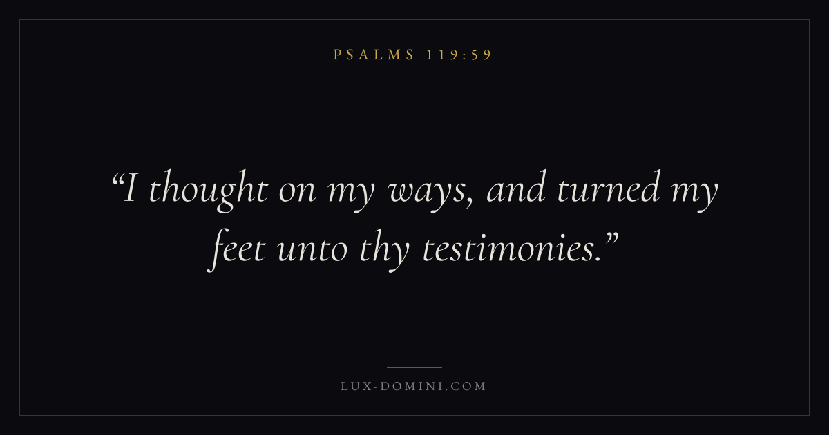 Books / Psalms / Chapter 119 / Verse 59 ← Psalms 119:58 Psalms 119:59 Psalms 119:60 → I thought on my ways, and turned my feet unto thy testimonies. Download verse card Share on Twitter Share on Facebook Pin it ✦ Key themes FaithHopePrayerJustice and mercyPraise Read with Hebrews 11:1Romans 10:17Romans 8:24Revelation 21:4 Related topics Bible verses about faithBible verses about hopeBible verses about prayerBible verses about justice and mercyBible verses about thankfulness and gratitude ✦ Psalms Chapter 119 verses V. 1 V. 2 V. 3 V. 4 V. 5 V. 6 V. 7 V. 8 V. 9 V. 10 V. 11 V. 12 V. 13 V. 14 V. 15 V. 16 V. 17 V. 18 V. 19 V. 20 V. 21 V. 22 V. 23 V. 24 V. 25 V. 26 V. 27 V. 28 V. 29 V. 30 V. 31 V. 32 V. 33 V. 34 V. 35 V. 36 V. 37 V. 38 V. 39 V. 40 V. 41 V. 42 V. 43 V. 44 V. 45 V. 46 V. 47 V. 48 V. 49 V. 50 V. 51 V. 52 V. 53 V. 54 V. 55 V. 56 V. 57 V. 58 V. 59 V. 60 V. 61 V. 62 V. 63 V. 64 V. 65 V. 66 V. 67 V. 68 V. 69 V. 70 V. 71 V. 72 V. 73 V. 74 V. 75 V. 76 V. 77 V. 78 V. 79 V. 80 V. 81 V. 82 V. 83 V. 84 V. 85 V. 86 V. 87 V. 88 V. 89 V. 90 V. 91 V. 92 V. 93 V. 94 V. 95 V. 96 V. 97 V. 98 V. 99 V. 100 V. 101 V. 102 V. 103 V. 104 V. 105 V. 106 V. 107 V. 108 V. 109 V. 110 V. 111 V. 112 V. 113 V. 114 V. 115 V. 116 V. 117 V. 118 V. 119 V. 120 V. 121 V. 122 V. 123 V. 124 V. 125 V. 126 V. 127 V. 128 V. 129 V. 130 V. 131 V. 132 V. 133 V. 134 V. 135 V. 136 V. 137 V. 138 V. 139 V. 140 V. 141 V. 142 V. 143 V. 144 V. 145 V. 146 V. 147 V. 148 V. 149 V. 150 V. 151 V. 152 V. 153 V. 154 V. 155 V. 156 V. 157 V. 158 V. 159 V. 160 V. 161 V. 162 V. 163 V. 164 V. 165 V. 166 V. 167 V. 168 V. 169 V. 170 V. 171 V. 172 V. 173 V. 174 V. 175 V. 176