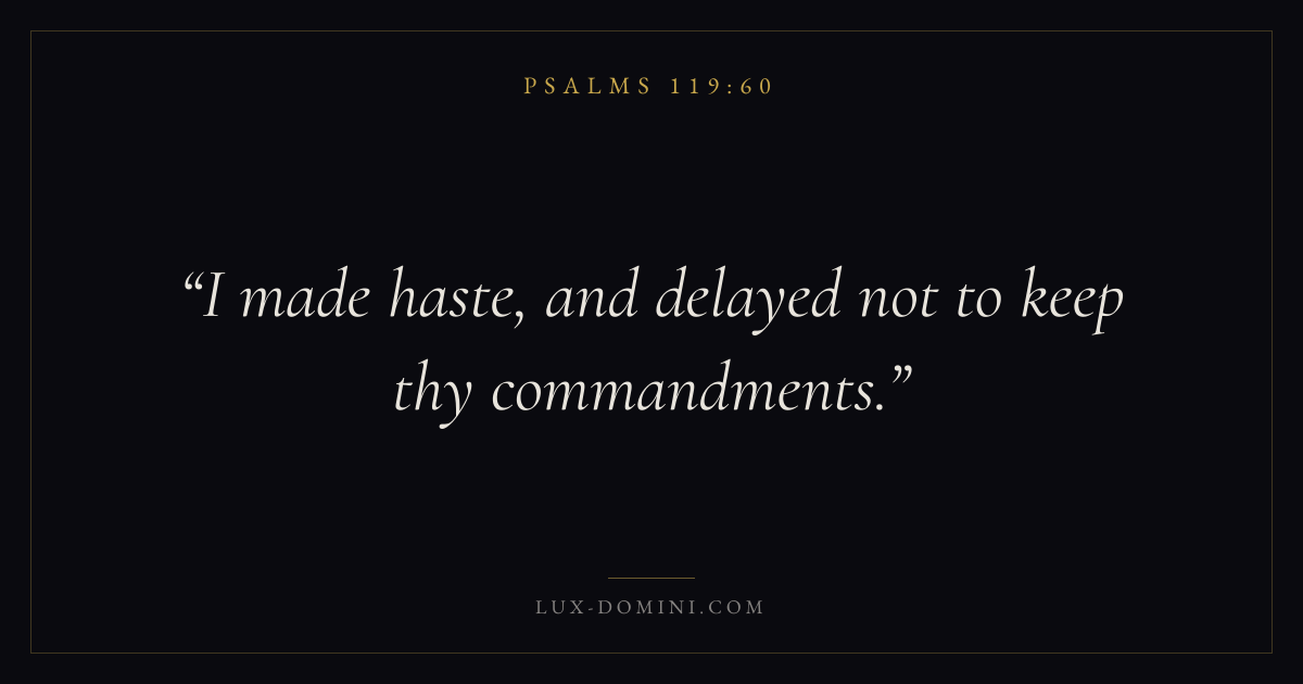 Books / Psalms / Chapter 119 / Verse 60 ← Psalms 119:59 Psalms 119:60 Psalms 119:61 → I made haste, and delayed not to keep thy commandments. Download verse card Share on Twitter Share on Facebook Pin it ✦ Key themes FaithHopePrayerJustice and mercyPraise Read with Hebrews 11:1Romans 10:17Romans 8:24Revelation 21:4 Related topics Bible verses about faithBible verses about hopeBible verses about prayerBible verses about justice and mercyBible verses about thankfulness and gratitude ✦ Psalms Chapter 119 verses V. 1 V. 2 V. 3 V. 4 V. 5 V. 6 V. 7 V. 8 V. 9 V. 10 V. 11 V. 12 V. 13 V. 14 V. 15 V. 16 V. 17 V. 18 V. 19 V. 20 V. 21 V. 22 V. 23 V. 24 V. 25 V. 26 V. 27 V. 28 V. 29 V. 30 V. 31 V. 32 V. 33 V. 34 V. 35 V. 36 V. 37 V. 38 V. 39 V. 40 V. 41 V. 42 V. 43 V. 44 V. 45 V. 46 V. 47 V. 48 V. 49 V. 50 V. 51 V. 52 V. 53 V. 54 V. 55 V. 56 V. 57 V. 58 V. 59 V. 60 V. 61 V. 62 V. 63 V. 64 V. 65 V. 66 V. 67 V. 68 V. 69 V. 70 V. 71 V. 72 V. 73 V. 74 V. 75 V. 76 V. 77 V. 78 V. 79 V. 80 V. 81 V. 82 V. 83 V. 84 V. 85 V. 86 V. 87 V. 88 V. 89 V. 90 V. 91 V. 92 V. 93 V. 94 V. 95 V. 96 V. 97 V. 98 V. 99 V. 100 V. 101 V. 102 V. 103 V. 104 V. 105 V. 106 V. 107 V. 108 V. 109 V. 110 V. 111 V. 112 V. 113 V. 114 V. 115 V. 116 V. 117 V. 118 V. 119 V. 120 V. 121 V. 122 V. 123 V. 124 V. 125 V. 126 V. 127 V. 128 V. 129 V. 130 V. 131 V. 132 V. 133 V. 134 V. 135 V. 136 V. 137 V. 138 V. 139 V. 140 V. 141 V. 142 V. 143 V. 144 V. 145 V. 146 V. 147 V. 148 V. 149 V. 150 V. 151 V. 152 V. 153 V. 154 V. 155 V. 156 V. 157 V. 158 V. 159 V. 160 V. 161 V. 162 V. 163 V. 164 V. 165 V. 166 V. 167 V. 168 V. 169 V. 170 V. 171 V. 172 V. 173 V. 174 V. 175 V. 176