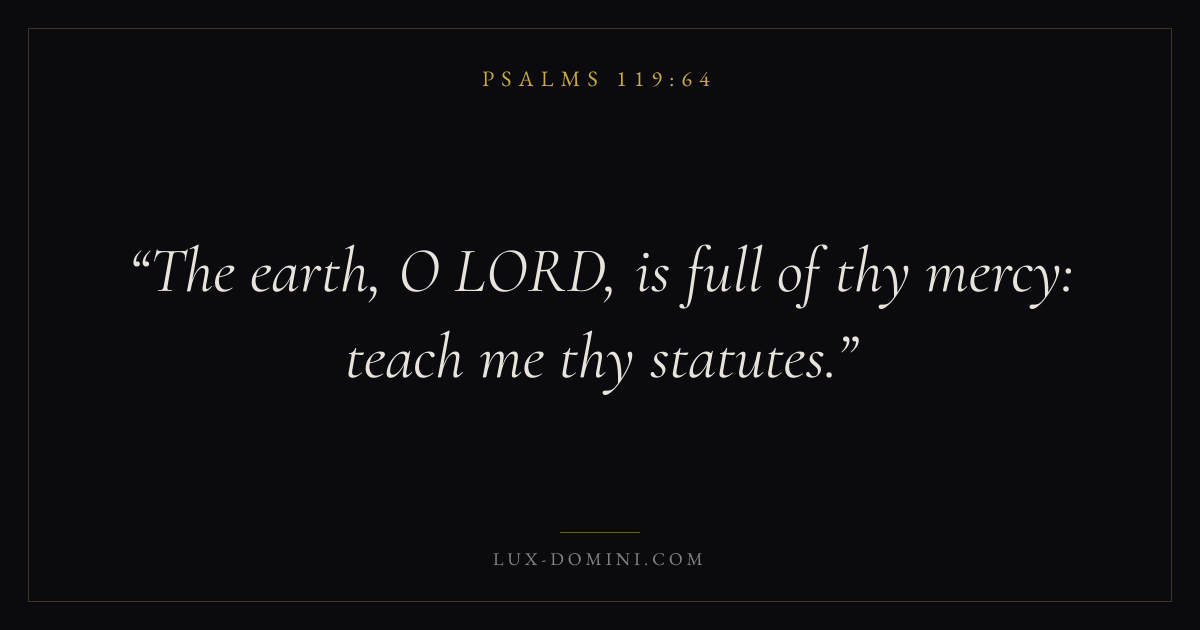 Books / Psalms / Chapter 119 / Verse 64 ← Psalms 119:63 Psalms 119:64 Psalms 119:65 → The earth, O LORD, is full of thy mercy: teach me thy statutes. Download verse card Share on Twitter Share on Facebook Pin it ✦ Key themes FaithHopePrayerJustice and mercyPraise Read with Hebrews 11:1Romans 10:17Romans 8:24Revelation 21:4 Related topics Bible verses about faithBible verses about hopeBible verses about prayerBible verses about justice and mercyBible verses about thankfulness and gratitude ✦ Psalms Chapter 119 verses V. 1 V. 2 V. 3 V. 4 V. 5 V. 6 V. 7 V. 8 V. 9 V. 10 V. 11 V. 12 V. 13 V. 14 V. 15 V. 16 V. 17 V. 18 V. 19 V. 20 V. 21 V. 22 V. 23 V. 24 V. 25 V. 26 V. 27 V. 28 V. 29 V. 30 V. 31 V. 32 V. 33 V. 34 V. 35 V. 36 V. 37 V. 38 V. 39 V. 40 V. 41 V. 42 V. 43 V. 44 V. 45 V. 46 V. 47 V. 48 V. 49 V. 50 V. 51 V. 52 V. 53 V. 54 V. 55 V. 56 V. 57 V. 58 V. 59 V. 60 V. 61 V. 62 V. 63 V. 64 V. 65 V. 66 V. 67 V. 68 V. 69 V. 70 V. 71 V. 72 V. 73 V. 74 V. 75 V. 76 V. 77 V. 78 V. 79 V. 80 V. 81 V. 82 V. 83 V. 84 V. 85 V. 86 V. 87 V. 88 V. 89 V. 90 V. 91 V. 92 V. 93 V. 94 V. 95 V. 96 V. 97 V. 98 V. 99 V. 100 V. 101 V. 102 V. 103 V. 104 V. 105 V. 106 V. 107 V. 108 V. 109 V. 110 V. 111 V. 112 V. 113 V. 114 V. 115 V. 116 V. 117 V. 118 V. 119 V. 120 V. 121 V. 122 V. 123 V. 124 V. 125 V. 126 V. 127 V. 128 V. 129 V. 130 V. 131 V. 132 V. 133 V. 134 V. 135 V. 136 V. 137 V. 138 V. 139 V. 140 V. 141 V. 142 V. 143 V. 144 V. 145 V. 146 V. 147 V. 148 V. 149 V. 150 V. 151 V. 152 V. 153 V. 154 V. 155 V. 156 V. 157 V. 158 V. 159 V. 160 V. 161 V. 162 V. 163 V. 164 V. 165 V. 166 V. 167 V. 168 V. 169 V. 170 V. 171 V. 172 V. 173 V. 174 V. 175 V. 176