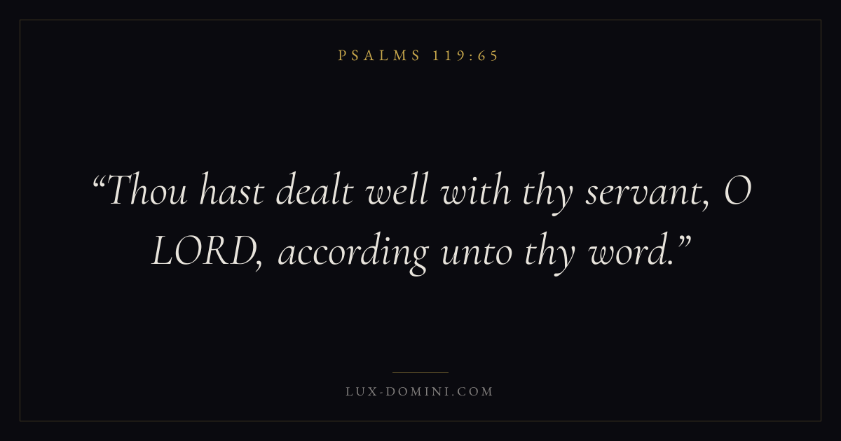 Books / Psalms / Chapter 119 / Verse 65 ← Psalms 119:64 Psalms 119:65 Psalms 119:66 → Thou hast dealt well with thy servant, O LORD, according unto thy word. Download verse card Share on Twitter Share on Facebook Pin it ✦ Key themes LoveFaithPrayerWisdomPraise Read with John 3:161 Corinthians 13:4Hebrews 11:1Romans 10:17 Related topics Bible verses about loveBible verses about faithBible verses about prayerBible verses about wisdomBible verses about thankfulness and gratitude ✦ Psalms Chapter 119 verses V. 1 V. 2 V. 3 V. 4 V. 5 V. 6 V. 7 V. 8 V. 9 V. 10 V. 11 V. 12 V. 13 V. 14 V. 15 V. 16 V. 17 V. 18 V. 19 V. 20 V. 21 V. 22 V. 23 V. 24 V. 25 V. 26 V. 27 V. 28 V. 29 V. 30 V. 31 V. 32 V. 33 V. 34 V. 35 V. 36 V. 37 V. 38 V. 39 V. 40 V. 41 V. 42 V. 43 V. 44 V. 45 V. 46 V. 47 V. 48 V. 49 V. 50 V. 51 V. 52 V. 53 V. 54 V. 55 V. 56 V. 57 V. 58 V. 59 V. 60 V. 61 V. 62 V. 63 V. 64 V. 65 V. 66 V. 67 V. 68 V. 69 V. 70 V. 71 V. 72 V. 73 V. 74 V. 75 V. 76 V. 77 V. 78 V. 79 V. 80 V. 81 V. 82 V. 83 V. 84 V. 85 V. 86 V. 87 V. 88 V. 89 V. 90 V. 91 V. 92 V. 93 V. 94 V. 95 V. 96 V. 97 V. 98 V. 99 V. 100 V. 101 V. 102 V. 103 V. 104 V. 105 V. 106 V. 107 V. 108 V. 109 V. 110 V. 111 V. 112 V. 113 V. 114 V. 115 V. 116 V. 117 V. 118 V. 119 V. 120 V. 121 V. 122 V. 123 V. 124 V. 125 V. 126 V. 127 V. 128 V. 129 V. 130 V. 131 V. 132 V. 133 V. 134 V. 135 V. 136 V. 137 V. 138 V. 139 V. 140 V. 141 V. 142 V. 143 V. 144 V. 145 V. 146 V. 147 V. 148 V. 149 V. 150 V. 151 V. 152 V. 153 V. 154 V. 155 V. 156 V. 157 V. 158 V. 159 V. 160 V. 161 V. 162 V. 163 V. 164 V. 165 V. 166 V. 167 V. 168 V. 169 V. 170 V. 171 V. 172 V. 173 V. 174 V. 175 V. 176