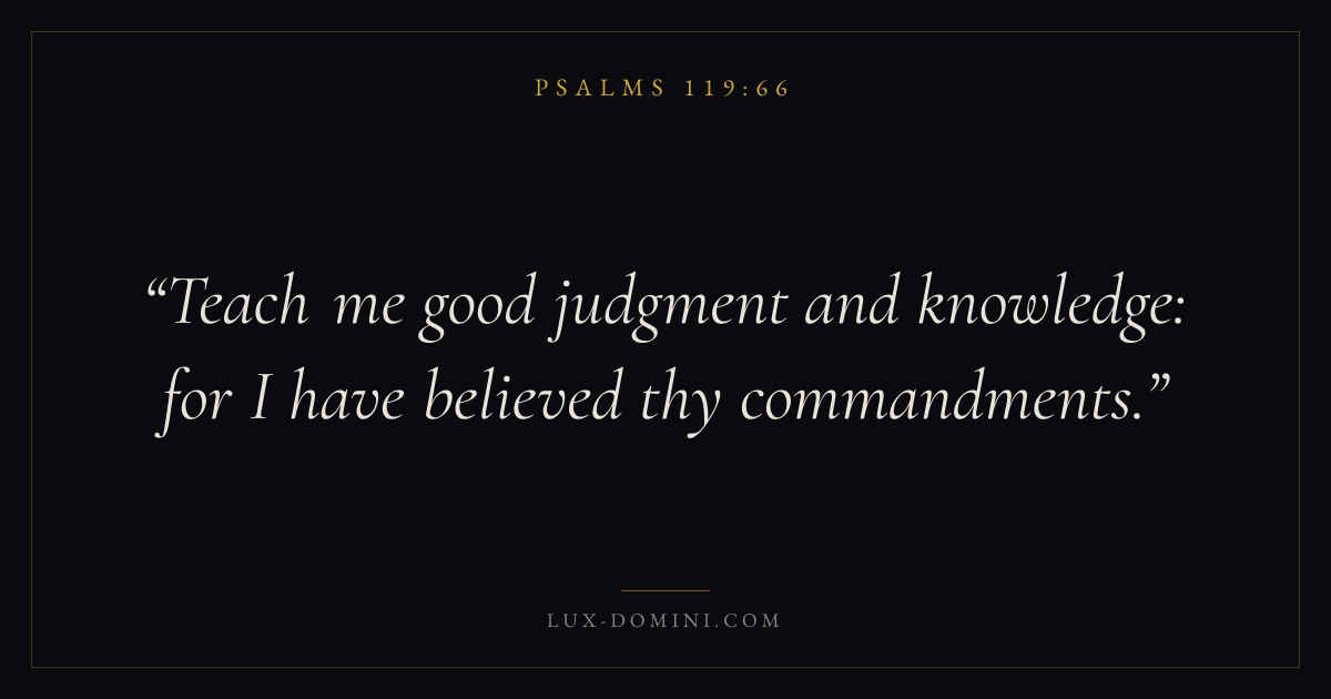 Books / Psalms / Chapter 119 / Verse 66 ← Psalms 119:65 Psalms 119:66 Psalms 119:67 → Teach me good judgment and knowledge: for I have believed thy commandments. Download verse card Share on Twitter Share on Facebook Pin it ✦ Key themes LoveFaithPrayerWisdomPraise Read with John 3:161 Corinthians 13:4Hebrews 11:1Romans 10:17 Related topics Bible verses about loveBible verses about faithBible verses about prayerBible verses about wisdomBible verses about thankfulness and gratitude ✦ Psalms Chapter 119 verses V. 1 V. 2 V. 3 V. 4 V. 5 V. 6 V. 7 V. 8 V. 9 V. 10 V. 11 V. 12 V. 13 V. 14 V. 15 V. 16 V. 17 V. 18 V. 19 V. 20 V. 21 V. 22 V. 23 V. 24 V. 25 V. 26 V. 27 V. 28 V. 29 V. 30 V. 31 V. 32 V. 33 V. 34 V. 35 V. 36 V. 37 V. 38 V. 39 V. 40 V. 41 V. 42 V. 43 V. 44 V. 45 V. 46 V. 47 V. 48 V. 49 V. 50 V. 51 V. 52 V. 53 V. 54 V. 55 V. 56 V. 57 V. 58 V. 59 V. 60 V. 61 V. 62 V. 63 V. 64 V. 65 V. 66 V. 67 V. 68 V. 69 V. 70 V. 71 V. 72 V. 73 V. 74 V. 75 V. 76 V. 77 V. 78 V. 79 V. 80 V. 81 V. 82 V. 83 V. 84 V. 85 V. 86 V. 87 V. 88 V. 89 V. 90 V. 91 V. 92 V. 93 V. 94 V. 95 V. 96 V. 97 V. 98 V. 99 V. 100 V. 101 V. 102 V. 103 V. 104 V. 105 V. 106 V. 107 V. 108 V. 109 V. 110 V. 111 V. 112 V. 113 V. 114 V. 115 V. 116 V. 117 V. 118 V. 119 V. 120 V. 121 V. 122 V. 123 V. 124 V. 125 V. 126 V. 127 V. 128 V. 129 V. 130 V. 131 V. 132 V. 133 V. 134 V. 135 V. 136 V. 137 V. 138 V. 139 V. 140 V. 141 V. 142 V. 143 V. 144 V. 145 V. 146 V. 147 V. 148 V. 149 V. 150 V. 151 V. 152 V. 153 V. 154 V. 155 V. 156 V. 157 V. 158 V. 159 V. 160 V. 161 V. 162 V. 163 V. 164 V. 165 V. 166 V. 167 V. 168 V. 169 V. 170 V. 171 V. 172 V. 173 V. 174 V. 175 V. 176