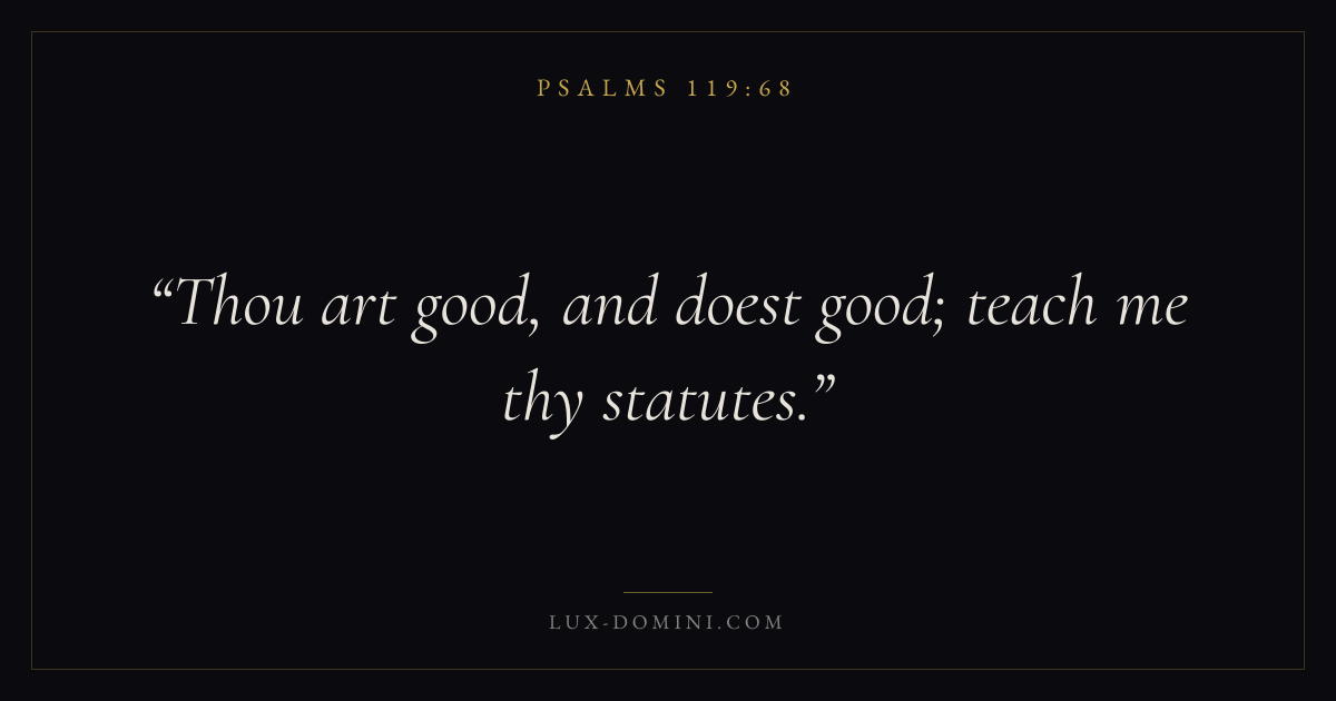 Books / Psalms / Chapter 119 / Verse 68 ← Psalms 119:67 Psalms 119:68 Psalms 119:69 → Thou art good, and doest good; teach me thy statutes. Download verse card Share on Twitter Share on Facebook Pin it ✦ Key themes LoveFaithPrayerWisdomPraise Read with John 3:161 Corinthians 13:4Hebrews 11:1Romans 10:17 Related topics Bible verses about loveBible verses about faithBible verses about prayerBible verses about wisdomBible verses about thankfulness and gratitude ✦ Psalms Chapter 119 verses V. 1 V. 2 V. 3 V. 4 V. 5 V. 6 V. 7 V. 8 V. 9 V. 10 V. 11 V. 12 V. 13 V. 14 V. 15 V. 16 V. 17 V. 18 V. 19 V. 20 V. 21 V. 22 V. 23 V. 24 V. 25 V. 26 V. 27 V. 28 V. 29 V. 30 V. 31 V. 32 V. 33 V. 34 V. 35 V. 36 V. 37 V. 38 V. 39 V. 40 V. 41 V. 42 V. 43 V. 44 V. 45 V. 46 V. 47 V. 48 V. 49 V. 50 V. 51 V. 52 V. 53 V. 54 V. 55 V. 56 V. 57 V. 58 V. 59 V. 60 V. 61 V. 62 V. 63 V. 64 V. 65 V. 66 V. 67 V. 68 V. 69 V. 70 V. 71 V. 72 V. 73 V. 74 V. 75 V. 76 V. 77 V. 78 V. 79 V. 80 V. 81 V. 82 V. 83 V. 84 V. 85 V. 86 V. 87 V. 88 V. 89 V. 90 V. 91 V. 92 V. 93 V. 94 V. 95 V. 96 V. 97 V. 98 V. 99 V. 100 V. 101 V. 102 V. 103 V. 104 V. 105 V. 106 V. 107 V. 108 V. 109 V. 110 V. 111 V. 112 V. 113 V. 114 V. 115 V. 116 V. 117 V. 118 V. 119 V. 120 V. 121 V. 122 V. 123 V. 124 V. 125 V. 126 V. 127 V. 128 V. 129 V. 130 V. 131 V. 132 V. 133 V. 134 V. 135 V. 136 V. 137 V. 138 V. 139 V. 140 V. 141 V. 142 V. 143 V. 144 V. 145 V. 146 V. 147 V. 148 V. 149 V. 150 V. 151 V. 152 V. 153 V. 154 V. 155 V. 156 V. 157 V. 158 V. 159 V. 160 V. 161 V. 162 V. 163 V. 164 V. 165 V. 166 V. 167 V. 168 V. 169 V. 170 V. 171 V. 172 V. 173 V. 174 V. 175 V. 176