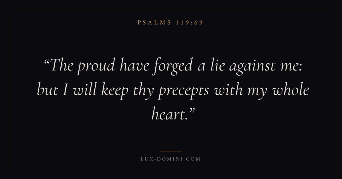 Books / Psalms / Chapter 119 / Verse 69 ← Psalms 119:68 Psalms 119:69 Psalms 119:70 → The proud have forged a lie against me: but I will keep thy precepts with my whole heart. Download verse card Share on Twitter Share on Facebook Pin it ✦ Key themes LoveFaithPrayerWisdomPraise Read with John 3:161 Corinthians 13:4Hebrews 11:1Romans 10:17 Related topics Bible verses about loveBible verses about faithBible verses about prayerBible verses about wisdomBible verses about thankfulness and gratitude ✦ Psalms Chapter 119 verses V. 1 V. 2 V. 3 V. 4 V. 5 V. 6 V. 7 V. 8 V. 9 V. 10 V. 11 V. 12 V. 13 V. 14 V. 15 V. 16 V. 17 V. 18 V. 19 V. 20 V. 21 V. 22 V. 23 V. 24 V. 25 V. 26 V. 27 V. 28 V. 29 V. 30 V. 31 V. 32 V. 33 V. 34 V. 35 V. 36 V. 37 V. 38 V. 39 V. 40 V. 41 V. 42 V. 43 V. 44 V. 45 V. 46 V. 47 V. 48 V. 49 V. 50 V. 51 V. 52 V. 53 V. 54 V. 55 V. 56 V. 57 V. 58 V. 59 V. 60 V. 61 V. 62 V. 63 V. 64 V. 65 V. 66 V. 67 V. 68 V. 69 V. 70 V. 71 V. 72 V. 73 V. 74 V. 75 V. 76 V. 77 V. 78 V. 79 V. 80 V. 81 V. 82 V. 83 V. 84 V. 85 V. 86 V. 87 V. 88 V. 89 V. 90 V. 91 V. 92 V. 93 V. 94 V. 95 V. 96 V. 97 V. 98 V. 99 V. 100 V. 101 V. 102 V. 103 V. 104 V. 105 V. 106 V. 107 V. 108 V. 109 V. 110 V. 111 V. 112 V. 113 V. 114 V. 115 V. 116 V. 117 V. 118 V. 119 V. 120 V. 121 V. 122 V. 123 V. 124 V. 125 V. 126 V. 127 V. 128 V. 129 V. 130 V. 131 V. 132 V. 133 V. 134 V. 135 V. 136 V. 137 V. 138 V. 139 V. 140 V. 141 V. 142 V. 143 V. 144 V. 145 V. 146 V. 147 V. 148 V. 149 V. 150 V. 151 V. 152 V. 153 V. 154 V. 155 V. 156 V. 157 V. 158 V. 159 V. 160 V. 161 V. 162 V. 163 V. 164 V. 165 V. 166 V. 167 V. 168 V. 169 V. 170 V. 171 V. 172 V. 173 V. 174 V. 175 V. 176