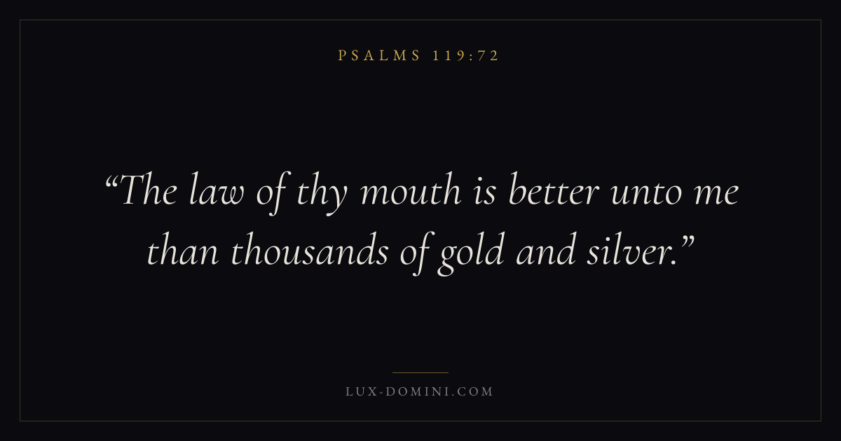 Books / Psalms / Chapter 119 / Verse 72 ← Psalms 119:71 Psalms 119:72 Psalms 119:73 → The law of thy mouth is better unto me than thousands of gold and silver. Download verse card Share on Twitter Share on Facebook Pin it ✦ Key themes LoveFaithPrayerWisdomPraise Read with John 3:161 Corinthians 13:4Hebrews 11:1Romans 10:17 Related topics Bible verses about loveBible verses about faithBible verses about prayerBible verses about wisdomBible verses about thankfulness and gratitude ✦ Psalms Chapter 119 verses V. 1 V. 2 V. 3 V. 4 V. 5 V. 6 V. 7 V. 8 V. 9 V. 10 V. 11 V. 12 V. 13 V. 14 V. 15 V. 16 V. 17 V. 18 V. 19 V. 20 V. 21 V. 22 V. 23 V. 24 V. 25 V. 26 V. 27 V. 28 V. 29 V. 30 V. 31 V. 32 V. 33 V. 34 V. 35 V. 36 V. 37 V. 38 V. 39 V. 40 V. 41 V. 42 V. 43 V. 44 V. 45 V. 46 V. 47 V. 48 V. 49 V. 50 V. 51 V. 52 V. 53 V. 54 V. 55 V. 56 V. 57 V. 58 V. 59 V. 60 V. 61 V. 62 V. 63 V. 64 V. 65 V. 66 V. 67 V. 68 V. 69 V. 70 V. 71 V. 72 V. 73 V. 74 V. 75 V. 76 V. 77 V. 78 V. 79 V. 80 V. 81 V. 82 V. 83 V. 84 V. 85 V. 86 V. 87 V. 88 V. 89 V. 90 V. 91 V. 92 V. 93 V. 94 V. 95 V. 96 V. 97 V. 98 V. 99 V. 100 V. 101 V. 102 V. 103 V. 104 V. 105 V. 106 V. 107 V. 108 V. 109 V. 110 V. 111 V. 112 V. 113 V. 114 V. 115 V. 116 V. 117 V. 118 V. 119 V. 120 V. 121 V. 122 V. 123 V. 124 V. 125 V. 126 V. 127 V. 128 V. 129 V. 130 V. 131 V. 132 V. 133 V. 134 V. 135 V. 136 V. 137 V. 138 V. 139 V. 140 V. 141 V. 142 V. 143 V. 144 V. 145 V. 146 V. 147 V. 148 V. 149 V. 150 V. 151 V. 152 V. 153 V. 154 V. 155 V. 156 V. 157 V. 158 V. 159 V. 160 V. 161 V. 162 V. 163 V. 164 V. 165 V. 166 V. 167 V. 168 V. 169 V. 170 V. 171 V. 172 V. 173 V. 174 V. 175 V. 176
