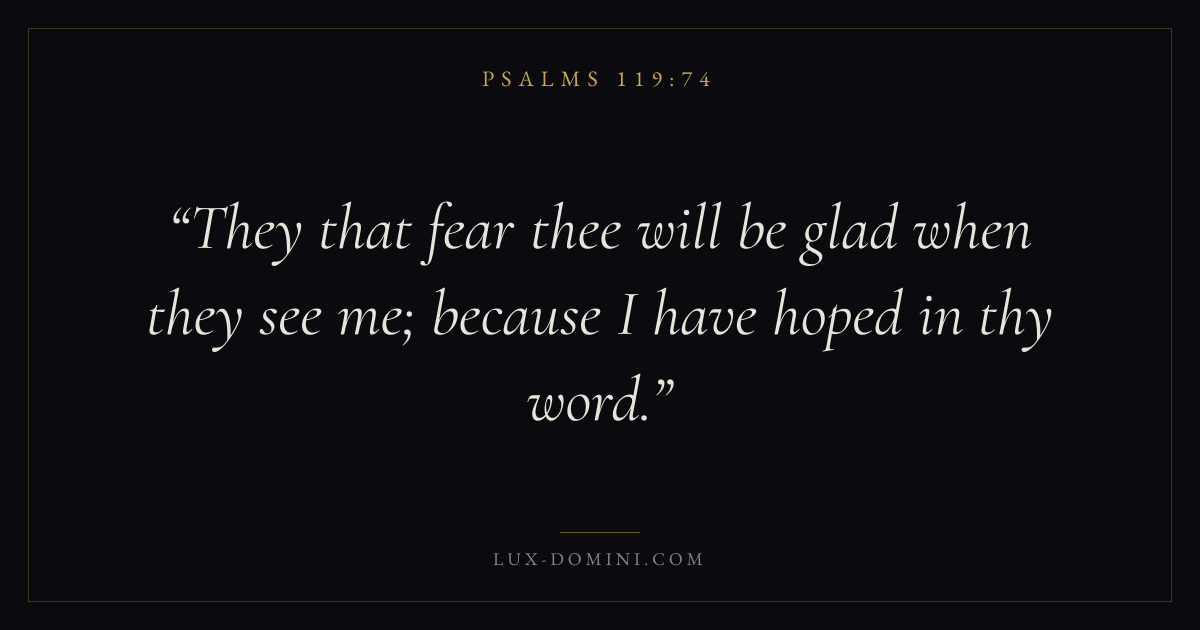 Books / Psalms / Chapter 119 / Verse 74 ← Psalms 119:73 Psalms 119:74 Psalms 119:75 → They that fear thee will be glad when they see me; because I have hoped in thy word. Download verse card Share on Twitter Share on Facebook Pin it ✦ Key themes FaithAnxiety and fearPrayerWisdomPraise Read with Hebrews 11:1Romans 10:17Philippians 4:6Isaiah 41:10 Related topics Bible verses about faithBible verses about anxiety and fearBible verses about prayerBible verses about wisdomBible verses about thankfulness and gratitude ✦ Psalms Chapter 119 verses V. 1 V. 2 V. 3 V. 4 V. 5 V. 6 V. 7 V. 8 V. 9 V. 10 V. 11 V. 12 V. 13 V. 14 V. 15 V. 16 V. 17 V. 18 V. 19 V. 20 V. 21 V. 22 V. 23 V. 24 V. 25 V. 26 V. 27 V. 28 V. 29 V. 30 V. 31 V. 32 V. 33 V. 34 V. 35 V. 36 V. 37 V. 38 V. 39 V. 40 V. 41 V. 42 V. 43 V. 44 V. 45 V. 46 V. 47 V. 48 V. 49 V. 50 V. 51 V. 52 V. 53 V. 54 V. 55 V. 56 V. 57 V. 58 V. 59 V. 60 V. 61 V. 62 V. 63 V. 64 V. 65 V. 66 V. 67 V. 68 V. 69 V. 70 V. 71 V. 72 V. 73 V. 74 V. 75 V. 76 V. 77 V. 78 V. 79 V. 80 V. 81 V. 82 V. 83 V. 84 V. 85 V. 86 V. 87 V. 88 V. 89 V. 90 V. 91 V. 92 V. 93 V. 94 V. 95 V. 96 V. 97 V. 98 V. 99 V. 100 V. 101 V. 102 V. 103 V. 104 V. 105 V. 106 V. 107 V. 108 V. 109 V. 110 V. 111 V. 112 V. 113 V. 114 V. 115 V. 116 V. 117 V. 118 V. 119 V. 120 V. 121 V. 122 V. 123 V. 124 V. 125 V. 126 V. 127 V. 128 V. 129 V. 130 V. 131 V. 132 V. 133 V. 134 V. 135 V. 136 V. 137 V. 138 V. 139 V. 140 V. 141 V. 142 V. 143 V. 144 V. 145 V. 146 V. 147 V. 148 V. 149 V. 150 V. 151 V. 152 V. 153 V. 154 V. 155 V. 156 V. 157 V. 158 V. 159 V. 160 V. 161 V. 162 V. 163 V. 164 V. 165 V. 166 V. 167 V. 168 V. 169 V. 170 V. 171 V. 172 V. 173 V. 174 V. 175 V. 176