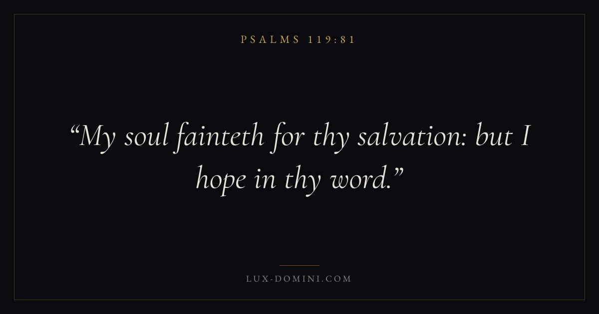 Books / Psalms / Chapter 119 / Verse 81 ← Psalms 119:80 Psalms 119:81 Psalms 119:82 → My soul fainteth for thy salvation: but I hope in thy word. Download verse card Share on Twitter Share on Facebook Pin it ✦ Key themes FaithHopePrayerSalvationPraise Read with Hebrews 11:1Romans 10:17Romans 8:24Revelation 21:4 Related topics Bible verses about faithBible verses about hopeBible verses about prayerBible verses about salvationBible verses about thankfulness and gratitude ✦ Psalms Chapter 119 verses V. 1 V. 2 V. 3 V. 4 V. 5 V. 6 V. 7 V. 8 V. 9 V. 10 V. 11 V. 12 V. 13 V. 14 V. 15 V. 16 V. 17 V. 18 V. 19 V. 20 V. 21 V. 22 V. 23 V. 24 V. 25 V. 26 V. 27 V. 28 V. 29 V. 30 V. 31 V. 32 V. 33 V. 34 V. 35 V. 36 V. 37 V. 38 V. 39 V. 40 V. 41 V. 42 V. 43 V. 44 V. 45 V. 46 V. 47 V. 48 V. 49 V. 50 V. 51 V. 52 V. 53 V. 54 V. 55 V. 56 V. 57 V. 58 V. 59 V. 60 V. 61 V. 62 V. 63 V. 64 V. 65 V. 66 V. 67 V. 68 V. 69 V. 70 V. 71 V. 72 V. 73 V. 74 V. 75 V. 76 V. 77 V. 78 V. 79 V. 80 V. 81 V. 82 V. 83 V. 84 V. 85 V. 86 V. 87 V. 88 V. 89 V. 90 V. 91 V. 92 V. 93 V. 94 V. 95 V. 96 V. 97 V. 98 V. 99 V. 100 V. 101 V. 102 V. 103 V. 104 V. 105 V. 106 V. 107 V. 108 V. 109 V. 110 V. 111 V. 112 V. 113 V. 114 V. 115 V. 116 V. 117 V. 118 V. 119 V. 120 V. 121 V. 122 V. 123 V. 124 V. 125 V. 126 V. 127 V. 128 V. 129 V. 130 V. 131 V. 132 V. 133 V. 134 V. 135 V. 136 V. 137 V. 138 V. 139 V. 140 V. 141 V. 142 V. 143 V. 144 V. 145 V. 146 V. 147 V. 148 V. 149 V. 150 V. 151 V. 152 V. 153 V. 154 V. 155 V. 156 V. 157 V. 158 V. 159 V. 160 V. 161 V. 162 V. 163 V. 164 V. 165 V. 166 V. 167 V. 168 V. 169 V. 170 V. 171 V. 172 V. 173 V. 174 V. 175 V. 176