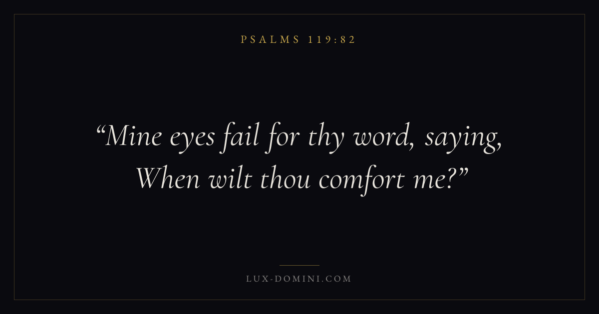 Books / Psalms / Chapter 119 / Verse 82 ← Psalms 119:81 Psalms 119:82 Psalms 119:83 → Mine eyes fail for thy word, saying, When wilt thou comfort me? Download verse card Share on Twitter Share on Facebook Pin it ✦ Key themes FaithHopePrayerSalvationPraise Read with Hebrews 11:1Romans 10:17Romans 8:24Revelation 21:4 Related topics Bible verses about faithBible verses about hopeBible verses about prayerBible verses about salvationBible verses about thankfulness and gratitude ✦ Psalms Chapter 119 verses V. 1 V. 2 V. 3 V. 4 V. 5 V. 6 V. 7 V. 8 V. 9 V. 10 V. 11 V. 12 V. 13 V. 14 V. 15 V. 16 V. 17 V. 18 V. 19 V. 20 V. 21 V. 22 V. 23 V. 24 V. 25 V. 26 V. 27 V. 28 V. 29 V. 30 V. 31 V. 32 V. 33 V. 34 V. 35 V. 36 V. 37 V. 38 V. 39 V. 40 V. 41 V. 42 V. 43 V. 44 V. 45 V. 46 V. 47 V. 48 V. 49 V. 50 V. 51 V. 52 V. 53 V. 54 V. 55 V. 56 V. 57 V. 58 V. 59 V. 60 V. 61 V. 62 V. 63 V. 64 V. 65 V. 66 V. 67 V. 68 V. 69 V. 70 V. 71 V. 72 V. 73 V. 74 V. 75 V. 76 V. 77 V. 78 V. 79 V. 80 V. 81 V. 82 V. 83 V. 84 V. 85 V. 86 V. 87 V. 88 V. 89 V. 90 V. 91 V. 92 V. 93 V. 94 V. 95 V. 96 V. 97 V. 98 V. 99 V. 100 V. 101 V. 102 V. 103 V. 104 V. 105 V. 106 V. 107 V. 108 V. 109 V. 110 V. 111 V. 112 V. 113 V. 114 V. 115 V. 116 V. 117 V. 118 V. 119 V. 120 V. 121 V. 122 V. 123 V. 124 V. 125 V. 126 V. 127 V. 128 V. 129 V. 130 V. 131 V. 132 V. 133 V. 134 V. 135 V. 136 V. 137 V. 138 V. 139 V. 140 V. 141 V. 142 V. 143 V. 144 V. 145 V. 146 V. 147 V. 148 V. 149 V. 150 V. 151 V. 152 V. 153 V. 154 V. 155 V. 156 V. 157 V. 158 V. 159 V. 160 V. 161 V. 162 V. 163 V. 164 V. 165 V. 166 V. 167 V. 168 V. 169 V. 170 V. 171 V. 172 V. 173 V. 174 V. 175 V. 176