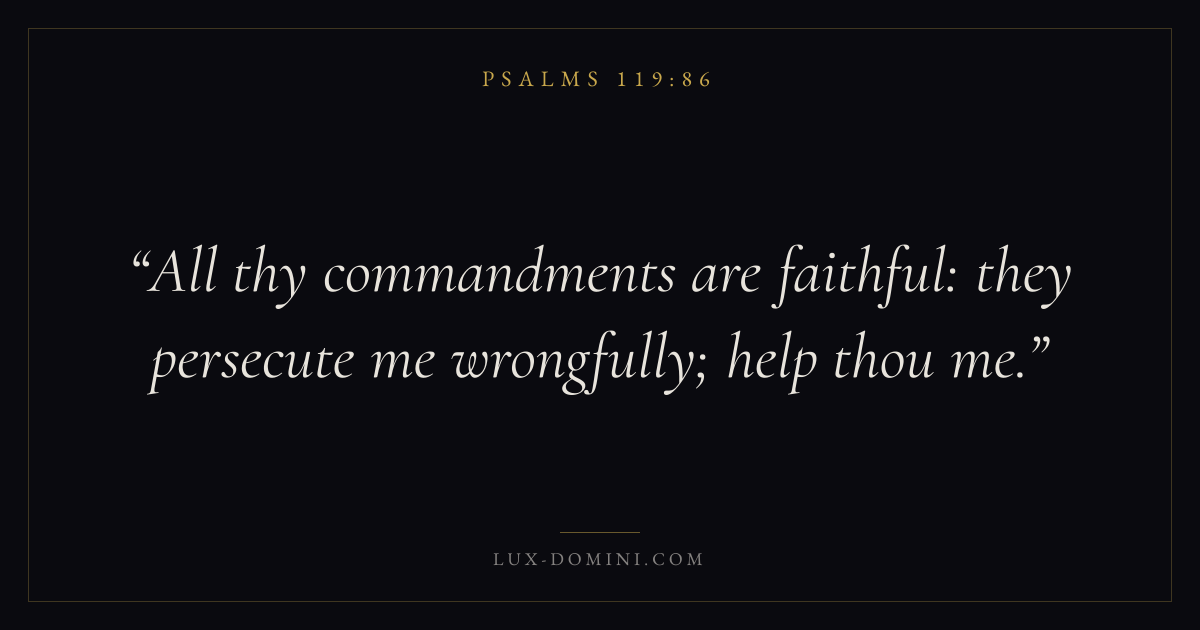 Books / Psalms / Chapter 119 / Verse 86 ← Psalms 119:85 Psalms 119:86 Psalms 119:87 → All thy commandments are faithful: they persecute me wrongfully; help thou me. Download verse card Share on Twitter Share on Facebook Pin it ✦ Key themes FaithHopePrayerSalvationPraise Read with Hebrews 11:1Romans 10:17Romans 8:24Revelation 21:4 Related topics Bible verses about faithBible verses about hopeBible verses about prayerBible verses about salvationBible verses about thankfulness and gratitude ✦ Psalms Chapter 119 verses V. 1 V. 2 V. 3 V. 4 V. 5 V. 6 V. 7 V. 8 V. 9 V. 10 V. 11 V. 12 V. 13 V. 14 V. 15 V. 16 V. 17 V. 18 V. 19 V. 20 V. 21 V. 22 V. 23 V. 24 V. 25 V. 26 V. 27 V. 28 V. 29 V. 30 V. 31 V. 32 V. 33 V. 34 V. 35 V. 36 V. 37 V. 38 V. 39 V. 40 V. 41 V. 42 V. 43 V. 44 V. 45 V. 46 V. 47 V. 48 V. 49 V. 50 V. 51 V. 52 V. 53 V. 54 V. 55 V. 56 V. 57 V. 58 V. 59 V. 60 V. 61 V. 62 V. 63 V. 64 V. 65 V. 66 V. 67 V. 68 V. 69 V. 70 V. 71 V. 72 V. 73 V. 74 V. 75 V. 76 V. 77 V. 78 V. 79 V. 80 V. 81 V. 82 V. 83 V. 84 V. 85 V. 86 V. 87 V. 88 V. 89 V. 90 V. 91 V. 92 V. 93 V. 94 V. 95 V. 96 V. 97 V. 98 V. 99 V. 100 V. 101 V. 102 V. 103 V. 104 V. 105 V. 106 V. 107 V. 108 V. 109 V. 110 V. 111 V. 112 V. 113 V. 114 V. 115 V. 116 V. 117 V. 118 V. 119 V. 120 V. 121 V. 122 V. 123 V. 124 V. 125 V. 126 V. 127 V. 128 V. 129 V. 130 V. 131 V. 132 V. 133 V. 134 V. 135 V. 136 V. 137 V. 138 V. 139 V. 140 V. 141 V. 142 V. 143 V. 144 V. 145 V. 146 V. 147 V. 148 V. 149 V. 150 V. 151 V. 152 V. 153 V. 154 V. 155 V. 156 V. 157 V. 158 V. 159 V. 160 V. 161 V. 162 V. 163 V. 164 V. 165 V. 166 V. 167 V. 168 V. 169 V. 170 V. 171 V. 172 V. 173 V. 174 V. 175 V. 176