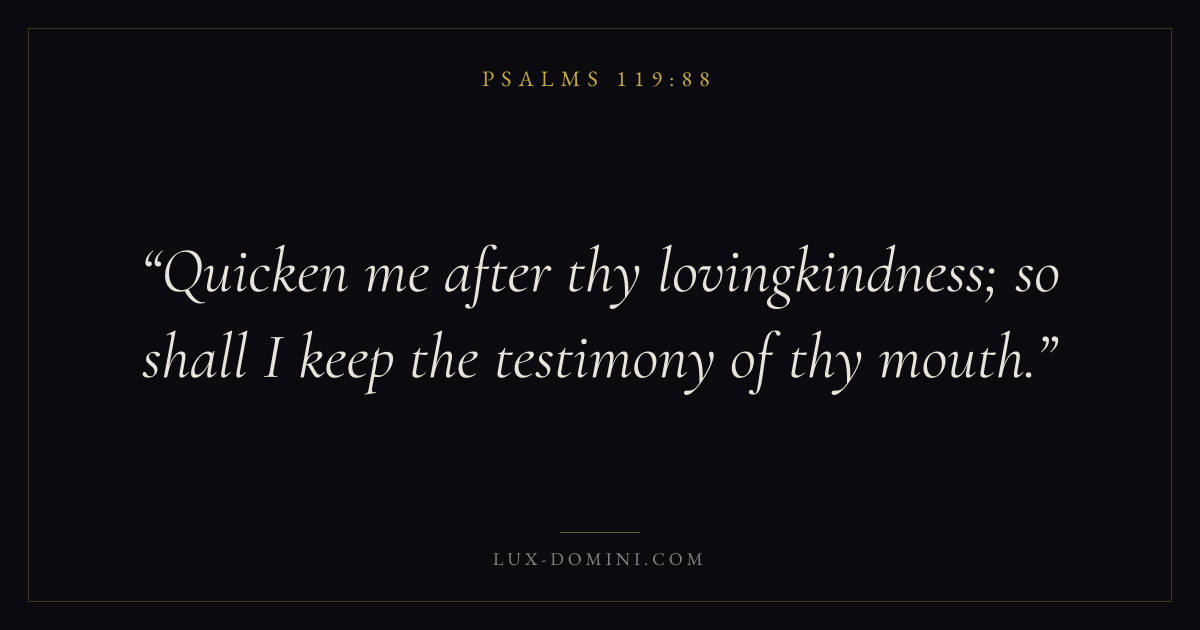 Books / Psalms / Chapter 119 / Verse 88 ← Psalms 119:87 Psalms 119:88 Psalms 119:89 → Quicken me after thy lovingkindness; so shall I keep the testimony of thy mouth. Download verse card Share on Twitter Share on Facebook Pin it ✦ Key themes FaithHopePrayerSalvationPraise Read with Hebrews 11:1Romans 10:17Romans 8:24Revelation 21:4 Related topics Bible verses about faithBible verses about hopeBible verses about prayerBible verses about salvationBible verses about thankfulness and gratitude ✦ Psalms Chapter 119 verses V. 1 V. 2 V. 3 V. 4 V. 5 V. 6 V. 7 V. 8 V. 9 V. 10 V. 11 V. 12 V. 13 V. 14 V. 15 V. 16 V. 17 V. 18 V. 19 V. 20 V. 21 V. 22 V. 23 V. 24 V. 25 V. 26 V. 27 V. 28 V. 29 V. 30 V. 31 V. 32 V. 33 V. 34 V. 35 V. 36 V. 37 V. 38 V. 39 V. 40 V. 41 V. 42 V. 43 V. 44 V. 45 V. 46 V. 47 V. 48 V. 49 V. 50 V. 51 V. 52 V. 53 V. 54 V. 55 V. 56 V. 57 V. 58 V. 59 V. 60 V. 61 V. 62 V. 63 V. 64 V. 65 V. 66 V. 67 V. 68 V. 69 V. 70 V. 71 V. 72 V. 73 V. 74 V. 75 V. 76 V. 77 V. 78 V. 79 V. 80 V. 81 V. 82 V. 83 V. 84 V. 85 V. 86 V. 87 V. 88 V. 89 V. 90 V. 91 V. 92 V. 93 V. 94 V. 95 V. 96 V. 97 V. 98 V. 99 V. 100 V. 101 V. 102 V. 103 V. 104 V. 105 V. 106 V. 107 V. 108 V. 109 V. 110 V. 111 V. 112 V. 113 V. 114 V. 115 V. 116 V. 117 V. 118 V. 119 V. 120 V. 121 V. 122 V. 123 V. 124 V. 125 V. 126 V. 127 V. 128 V. 129 V. 130 V. 131 V. 132 V. 133 V. 134 V. 135 V. 136 V. 137 V. 138 V. 139 V. 140 V. 141 V. 142 V. 143 V. 144 V. 145 V. 146 V. 147 V. 148 V. 149 V. 150 V. 151 V. 152 V. 153 V. 154 V. 155 V. 156 V. 157 V. 158 V. 159 V. 160 V. 161 V. 162 V. 163 V. 164 V. 165 V. 166 V. 167 V. 168 V. 169 V. 170 V. 171 V. 172 V. 173 V. 174 V. 175 V. 176