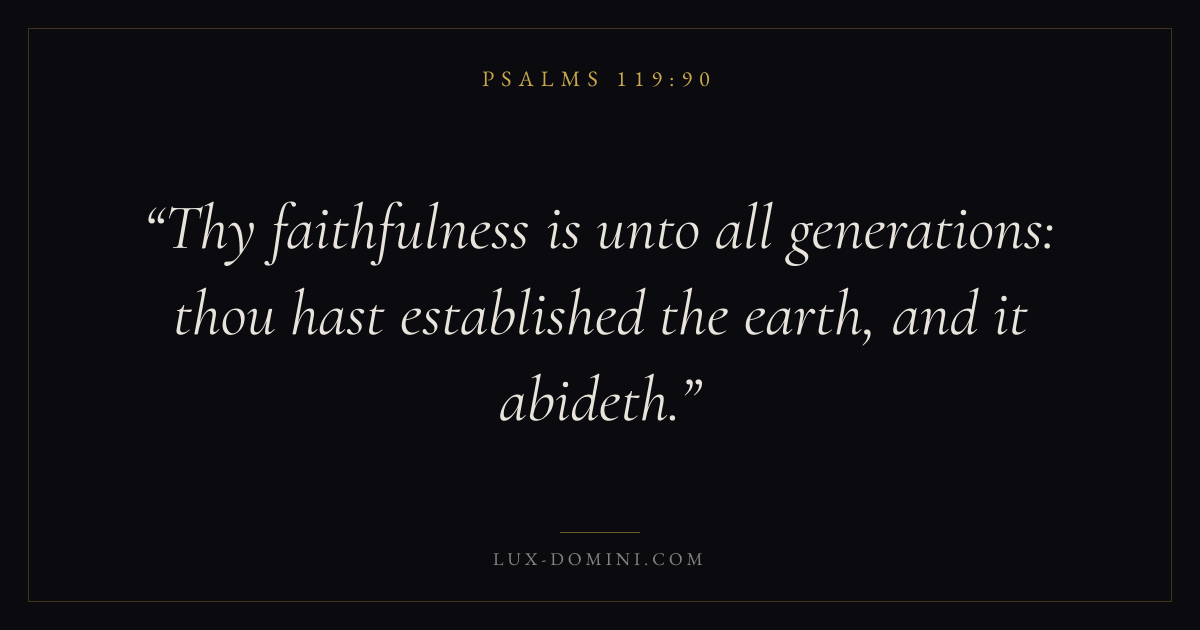 Books / Psalms / Chapter 119 / Verse 90 ← Psalms 119:89 Psalms 119:90 Psalms 119:91 → Thy faithfulness is unto all generations: thou hast established the earth, and it abideth. Download verse card Share on Twitter Share on Facebook Pin it ✦ Key themes FaithPrayerTruthPraise Read with Hebrews 11:1Romans 10:17Matthew 6:9Luke 18:1 Related topics Bible verses about faithBible verses about prayerBible verses about truthBible verses about thankfulness and gratitude ✦ Psalms Chapter 119 verses V. 1 V. 2 V. 3 V. 4 V. 5 V. 6 V. 7 V. 8 V. 9 V. 10 V. 11 V. 12 V. 13 V. 14 V. 15 V. 16 V. 17 V. 18 V. 19 V. 20 V. 21 V. 22 V. 23 V. 24 V. 25 V. 26 V. 27 V. 28 V. 29 V. 30 V. 31 V. 32 V. 33 V. 34 V. 35 V. 36 V. 37 V. 38 V. 39 V. 40 V. 41 V. 42 V. 43 V. 44 V. 45 V. 46 V. 47 V. 48 V. 49 V. 50 V. 51 V. 52 V. 53 V. 54 V. 55 V. 56 V. 57 V. 58 V. 59 V. 60 V. 61 V. 62 V. 63 V. 64 V. 65 V. 66 V. 67 V. 68 V. 69 V. 70 V. 71 V. 72 V. 73 V. 74 V. 75 V. 76 V. 77 V. 78 V. 79 V. 80 V. 81 V. 82 V. 83 V. 84 V. 85 V. 86 V. 87 V. 88 V. 89 V. 90 V. 91 V. 92 V. 93 V. 94 V. 95 V. 96 V. 97 V. 98 V. 99 V. 100 V. 101 V. 102 V. 103 V. 104 V. 105 V. 106 V. 107 V. 108 V. 109 V. 110 V. 111 V. 112 V. 113 V. 114 V. 115 V. 116 V. 117 V. 118 V. 119 V. 120 V. 121 V. 122 V. 123 V. 124 V. 125 V. 126 V. 127 V. 128 V. 129 V. 130 V. 131 V. 132 V. 133 V. 134 V. 135 V. 136 V. 137 V. 138 V. 139 V. 140 V. 141 V. 142 V. 143 V. 144 V. 145 V. 146 V. 147 V. 148 V. 149 V. 150 V. 151 V. 152 V. 153 V. 154 V. 155 V. 156 V. 157 V. 158 V. 159 V. 160 V. 161 V. 162 V. 163 V. 164 V. 165 V. 166 V. 167 V. 168 V. 169 V. 170 V. 171 V. 172 V. 173 V. 174 V. 175 V. 176