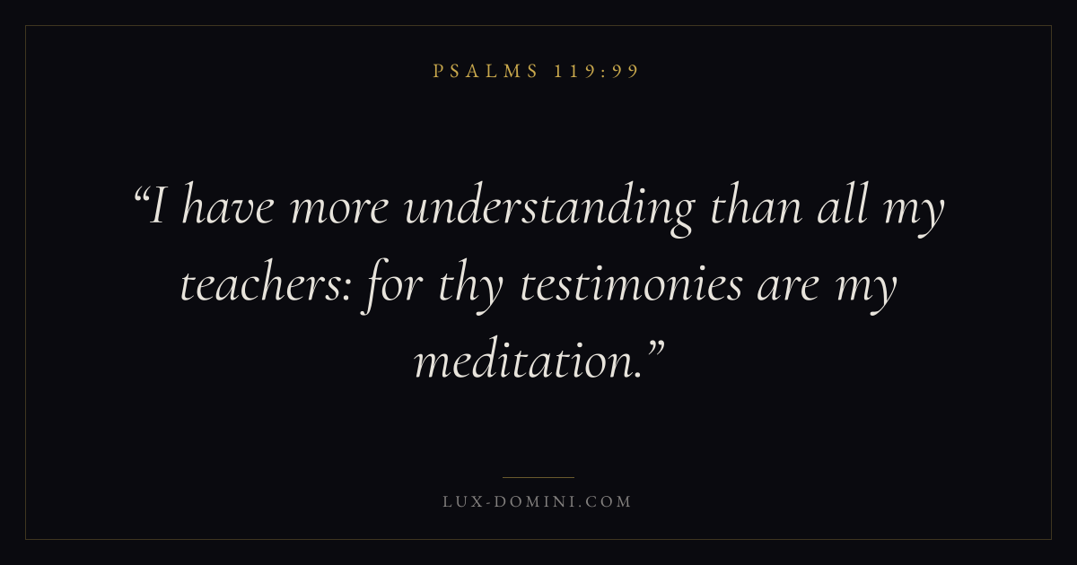 Books / Psalms / Chapter 119 / Verse 99 ← Psalms 119:98 Psalms 119:99 Psalms 119:100 → I have more understanding than all my teachers: for thy testimonies are my meditation. Download verse card Share on Twitter Share on Facebook Pin it ✦ Key themes LoveFaithPrayerWisdomPraise Read with John 3:161 Corinthians 13:4Hebrews 11:1Romans 10:17 Related topics Bible verses about loveBible verses about faithBible verses about prayerBible verses about wisdomBible verses about thankfulness and gratitude ✦ Psalms Chapter 119 verses V. 1 V. 2 V. 3 V. 4 V. 5 V. 6 V. 7 V. 8 V. 9 V. 10 V. 11 V. 12 V. 13 V. 14 V. 15 V. 16 V. 17 V. 18 V. 19 V. 20 V. 21 V. 22 V. 23 V. 24 V. 25 V. 26 V. 27 V. 28 V. 29 V. 30 V. 31 V. 32 V. 33 V. 34 V. 35 V. 36 V. 37 V. 38 V. 39 V. 40 V. 41 V. 42 V. 43 V. 44 V. 45 V. 46 V. 47 V. 48 V. 49 V. 50 V. 51 V. 52 V. 53 V. 54 V. 55 V. 56 V. 57 V. 58 V. 59 V. 60 V. 61 V. 62 V. 63 V. 64 V. 65 V. 66 V. 67 V. 68 V. 69 V. 70 V. 71 V. 72 V. 73 V. 74 V. 75 V. 76 V. 77 V. 78 V. 79 V. 80 V. 81 V. 82 V. 83 V. 84 V. 85 V. 86 V. 87 V. 88 V. 89 V. 90 V. 91 V. 92 V. 93 V. 94 V. 95 V. 96 V. 97 V. 98 V. 99 V. 100 V. 101 V. 102 V. 103 V. 104 V. 105 V. 106 V. 107 V. 108 V. 109 V. 110 V. 111 V. 112 V. 113 V. 114 V. 115 V. 116 V. 117 V. 118 V. 119 V. 120 V. 121 V. 122 V. 123 V. 124 V. 125 V. 126 V. 127 V. 128 V. 129 V. 130 V. 131 V. 132 V. 133 V. 134 V. 135 V. 136 V. 137 V. 138 V. 139 V. 140 V. 141 V. 142 V. 143 V. 144 V. 145 V. 146 V. 147 V. 148 V. 149 V. 150 V. 151 V. 152 V. 153 V. 154 V. 155 V. 156 V. 157 V. 158 V. 159 V. 160 V. 161 V. 162 V. 163 V. 164 V. 165 V. 166 V. 167 V. 168 V. 169 V. 170 V. 171 V. 172 V. 173 V. 174 V. 175 V. 176