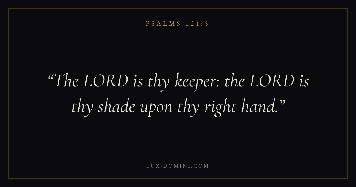 Books / Psalms / Chapter 121 / Verse 5 ← Psalms 121:4 Psalms 121:5 Psalms 121:6 → The LORD is thy keeper: the LORD is thy shade upon thy right hand. Download verse card Share on Twitter Share on Facebook Pin it ✦ Key themes FaithPrayerPraiseLament Read with Hebrews 11:1Romans 10:17Matthew 6:9Luke 18:1 Related topics Bible verses about faithBible verses about prayerBible verses about thankfulness and gratitudeBible verses about grief and loss ✦ Psalms Chapter 121 verses V. 1 V. 2 V. 3 V. 4 V. 5 V. 6 V. 7 V. 8