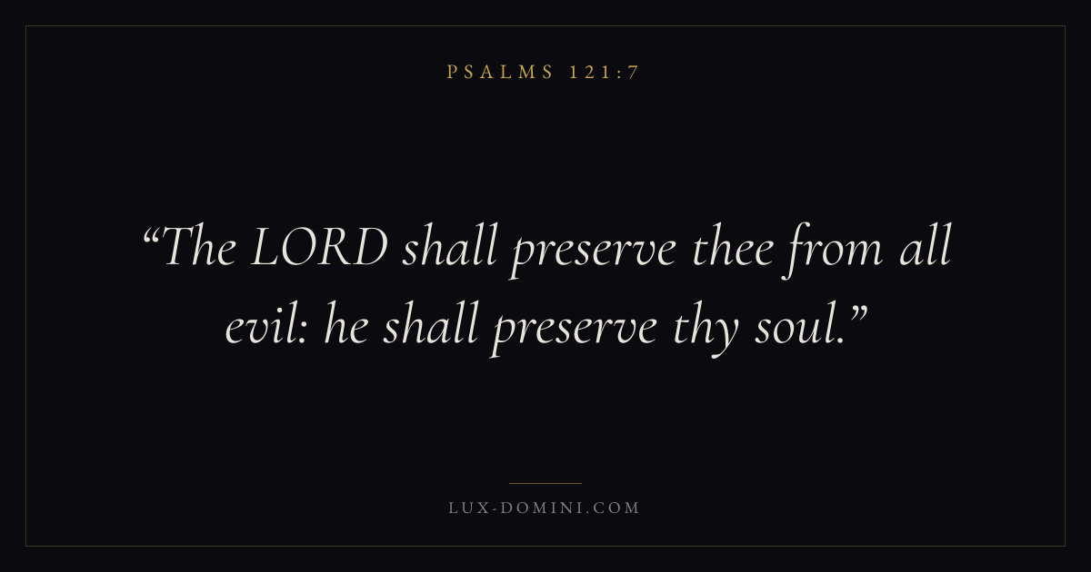 Books / Psalms / Chapter 121 / Verse 7 ← Psalms 121:6 Psalms 121:7 Psalms 121:8 → The LORD shall preserve thee from all evil: he shall preserve thy soul. Download verse card Share on Twitter Share on Facebook Pin it ✦ Key themes FaithPrayerPraiseLament Read with Hebrews 11:1Romans 10:17Matthew 6:9Luke 18:1 Related topics Bible verses about protectionBible verses about faithBible verses about prayerBible verses about thankfulness and gratitudeBible verses about grief and loss ✦ Psalms Chapter 121 verses V. 1 V. 2 V. 3 V. 4 V. 5 V. 6 V. 7 V. 8