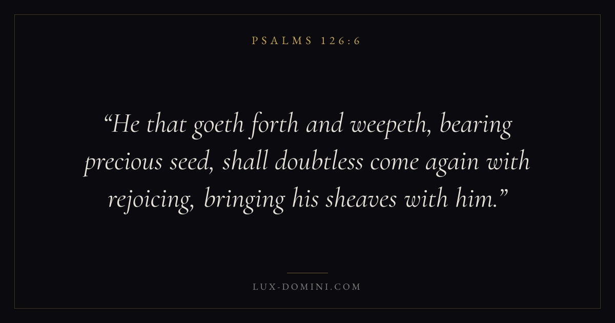 He that goeth forth and weepeth, bearing precious seed, shall doubtless come again with rejoicing, bringing his sheaves with him.