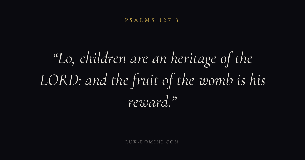 Books / Psalms / Chapter 127 / Verse 3 ← Psalms 127:2 Psalms 127:3 Psalms 127:4 → Lo, children are an heritage of the LORD: and the fruit of the womb is his reward. Download verse card Share on Twitter Share on Facebook Pin it ✦ Key themes FaithPrayerPraiseLament Read with Hebrews 11:1Romans 10:17Matthew 6:9Luke 18:1 Related topics Bible verses about familyBible verses about childrenBible verses for a new babyBible verses about faithBible verses about prayerBible verses about thankfulness and gratitudeBible verses about grief and loss ✦ Psalms Chapter 127 verses V. 1 V. 2 V. 3 V. 4 V. 5