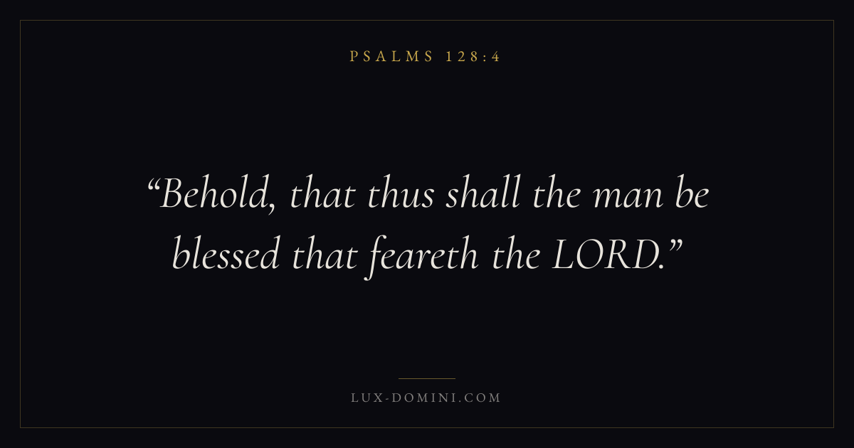 Books / Psalms / Chapter 128 / Verse 4 ← Psalms 128:3 Psalms 128:4 Psalms 128:5 → Behold, that thus shall the man be blessed that feareth the LORD. Download verse card Share on Twitter Share on Facebook Pin it ✦ Key themes FaithPrayerPraiseLament Read with Hebrews 11:1Romans 10:17Matthew 6:9Luke 18:1 Related topics Bible verses about faithBible verses about prayerBible verses about thankfulness and gratitudeBible verses about grief and loss ✦ Psalms Chapter 128 verses V. 1 V. 2 V. 3 V. 4 V. 5 V. 6