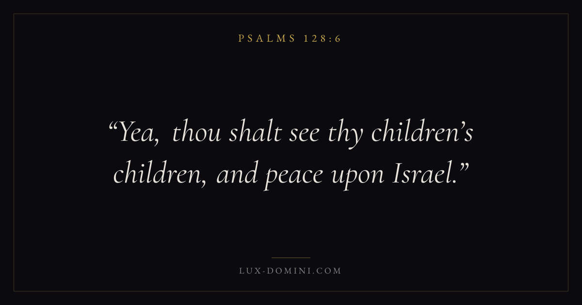 Books / Psalms / Chapter 128 / Verse 6 ← Psalms 128:5 Psalms 128:6 Psalms 129:1 → Yea, thou shalt see thy children’s children, and peace upon Israel. Download verse card Share on Twitter Share on Facebook Pin it ✦ Key themes FaithPrayerPeacePraise Read with Hebrews 11:1Romans 10:17Matthew 6:9Luke 18:1 Related topics Bible verses about faithBible verses about prayerBible verses about peaceBible verses about thankfulness and gratitude ✦ Psalms Chapter 128 verses V. 1 V. 2 V. 3 V. 4 V. 5 V. 6