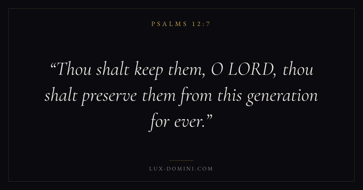 Books / Psalms / Chapter 12 / Verse 7 ← Psalms 12:6 Psalms 12:7 Psalms 12:8 → Thou shalt keep them, O LORD, thou shalt preserve them from this generation for ever. Download verse card Share on Twitter Share on Facebook Pin it ✦ Key themes FaithPrayerPraiseLament Read with Hebrews 11:1Romans 10:17Matthew 6:9Luke 18:1 Related topics Bible verses about faithBible verses about prayerBible verses about thankfulness and gratitudeBible verses about grief and loss ✦ Psalms Chapter 12 verses V. 1 V. 2 V. 3 V. 4 V. 5 V. 6 V. 7 V. 8