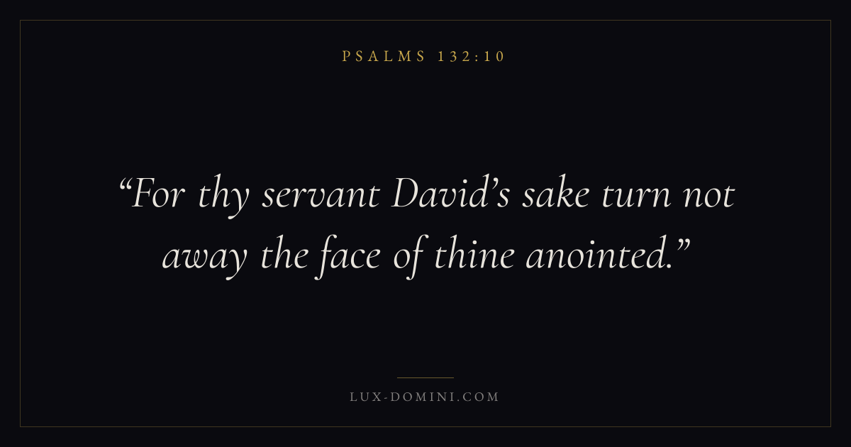 Books / Psalms / Chapter 132 / Verse 10 ← Psalms 132:9 Psalms 132:10 Psalms 132:11 → For thy servant David’s sake turn not away the face of thine anointed. Download verse card Share on Twitter Share on Facebook Pin it ✦ Key themes FaithPrayerPraiseLament Read with Hebrews 11:1Romans 10:17Matthew 6:9Luke 18:1 Related topics Bible verses about faithBible verses about prayerBible verses about thankfulness and gratitudeBible verses about grief and loss ✦ Psalms Chapter 132 verses V. 1 V. 2 V. 3 V. 4 V. 5 V. 6 V. 7 V. 8 V. 9 V. 10 V. 11 V. 12 V. 13 V. 14 V. 15 V. 16 V. 17 V. 18