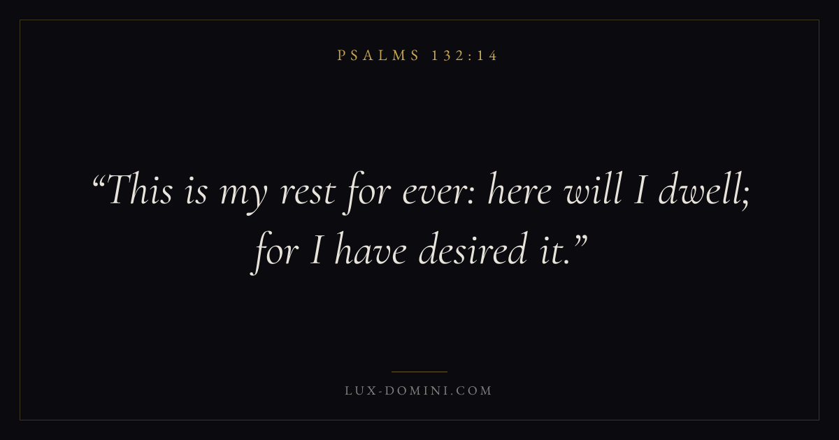 Books / Psalms / Chapter 132 / Verse 14 ← Psalms 132:13 Psalms 132:14 Psalms 132:15 → This is my rest for ever: here will I dwell; for I have desired it. Download verse card Share on Twitter Share on Facebook Pin it ✦ Key themes LoveFaithPrayerPeacePraise Read with John 3:161 Corinthians 13:4Hebrews 11:1Romans 10:17 Related topics Bible verses about loveBible verses about faithBible verses about prayerBible verses about peaceBible verses about thankfulness and gratitude ✦ Psalms Chapter 132 verses V. 1 V. 2 V. 3 V. 4 V. 5 V. 6 V. 7 V. 8 V. 9 V. 10 V. 11 V. 12 V. 13 V. 14 V. 15 V. 16 V. 17 V. 18