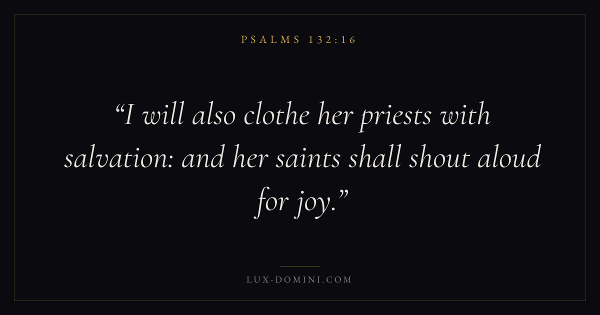 Books / Psalms / Chapter 132 / Verse 16 ← Psalms 132:15 Psalms 132:16 Psalms 132:17 → I will also clothe her priests with salvation: and her saints shall shout aloud for joy. Download verse card Share on Twitter Share on Facebook Pin it ✦ Key themes LoveFaithPrayerSalvationPraise Read with John 3:161 Corinthians 13:4Hebrews 11:1Romans 10:17 Related topics Bible verses about loveBible verses about faithBible verses about prayerBible verses about salvationBible verses about thankfulness and gratitude ✦ Psalms Chapter 132 verses V. 1 V. 2 V. 3 V. 4 V. 5 V. 6 V. 7 V. 8 V. 9 V. 10 V. 11 V. 12 V. 13 V. 14 V. 15 V. 16 V. 17 V. 18