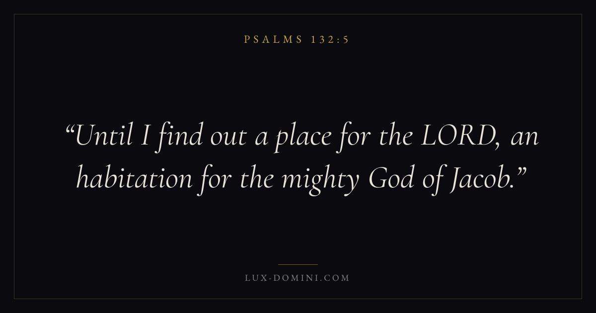 Books / Psalms / Chapter 132 / Verse 5 ← Psalms 132:4 Psalms 132:5 Psalms 132:6 → Until I find out a place for the LORD, an habitation for the mighty God of Jacob. Download verse card Share on Twitter Share on Facebook Pin it ✦ Key themes FaithPrayerPraiseLament Read with Hebrews 11:1Romans 10:17Matthew 6:9Luke 18:1 Related topics Bible verses about faithBible verses about prayerBible verses about thankfulness and gratitudeBible verses about grief and loss ✦ Psalms Chapter 132 verses V. 1 V. 2 V. 3 V. 4 V. 5 V. 6 V. 7 V. 8 V. 9 V. 10 V. 11 V. 12 V. 13 V. 14 V. 15 V. 16 V. 17 V. 18