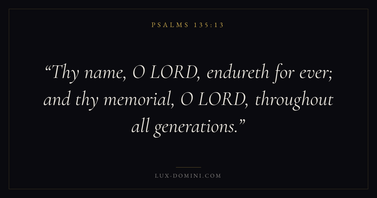 Books / Psalms / Chapter 135 / Verse 13 ← Psalms 135:12 Psalms 135:13 Psalms 135:14 → Thy name, O LORD, endureth for ever; and thy memorial, O LORD, throughout all generations. Download verse card Share on Twitter Share on Facebook Pin it ✦ Key themes FaithPrayerGracePraise Read with Hebrews 11:1Romans 10:17Matthew 6:9Luke 18:1 Related topics Bible verses about faithBible verses about prayerBible verses about graceBible verses about thankfulness and gratitude ✦ Psalms Chapter 135 verses V. 1 V. 2 V. 3 V. 4 V. 5 V. 6 V. 7 V. 8 V. 9 V. 10 V. 11 V. 12 V. 13 V. 14 V. 15 V. 16 V. 17 V. 18 V. 19 V. 20 V. 21