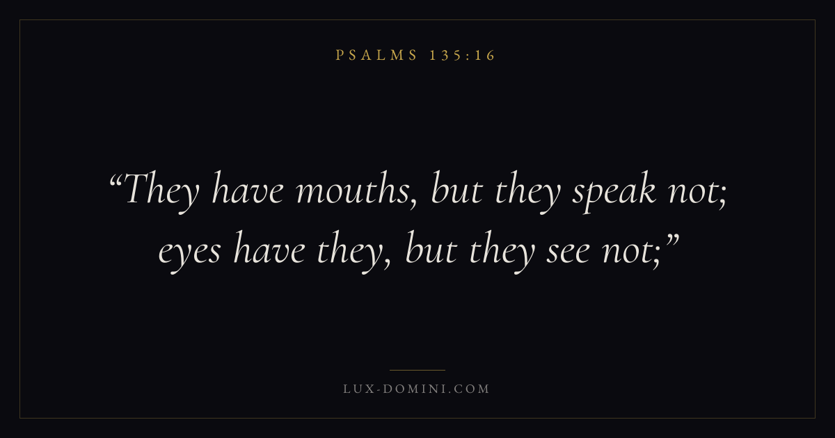 Books / Psalms / Chapter 135 / Verse 16 ← Psalms 135:15 Psalms 135:16 Psalms 135:17 → They have mouths, but they speak not; eyes have they, but they see not; Download verse card Share on Twitter Share on Facebook Pin it ✦ Key themes FaithPrayerPraiseLament Read with Hebrews 11:1Romans 10:17Matthew 6:9Luke 18:1 Related topics Bible verses about faithBible verses about prayerBible verses about thankfulness and gratitudeBible verses about grief and loss ✦ Psalms Chapter 135 verses V. 1 V. 2 V. 3 V. 4 V. 5 V. 6 V. 7 V. 8 V. 9 V. 10 V. 11 V. 12 V. 13 V. 14 V. 15 V. 16 V. 17 V. 18 V. 19 V. 20 V. 21