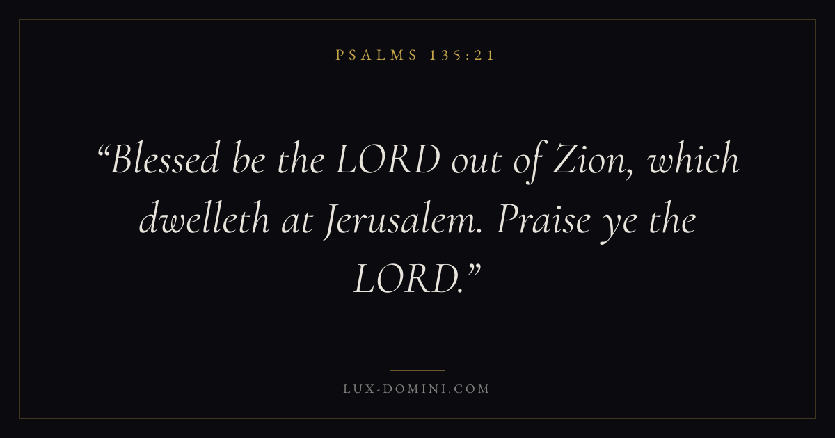 Books / Psalms / Chapter 135 / Verse 21 ← Psalms 135:20 Psalms 135:21 Psalms 136:1 → Blessed be the LORD out of Zion, which dwelleth at Jerusalem. Praise ye the LORD. Download verse card Share on Twitter Share on Facebook Pin it ✦ Key themes FaithPrayerPraiseLament Read with Hebrews 11:1Romans 10:17Matthew 6:9Luke 18:1 Related topics Bible verses about faithBible verses about prayerBible verses about thankfulness and gratitudeBible verses about grief and loss Glossary Jerusalem Place Biblical settlement. Modern identification: Jerusalem. Zion Place Biblical settlement. Modern identification: Jerusalem. ✦ Psalms Chapter 135 verses V. 1 V. 2 V. 3 V. 4 V. 5 V. 6 V. 7 V. 8 V. 9 V. 10 V. 11 V. 12 V. 13 V. 14 V. 15 V. 16 V. 17 V. 18 V. 19 V. 20 V. 21
