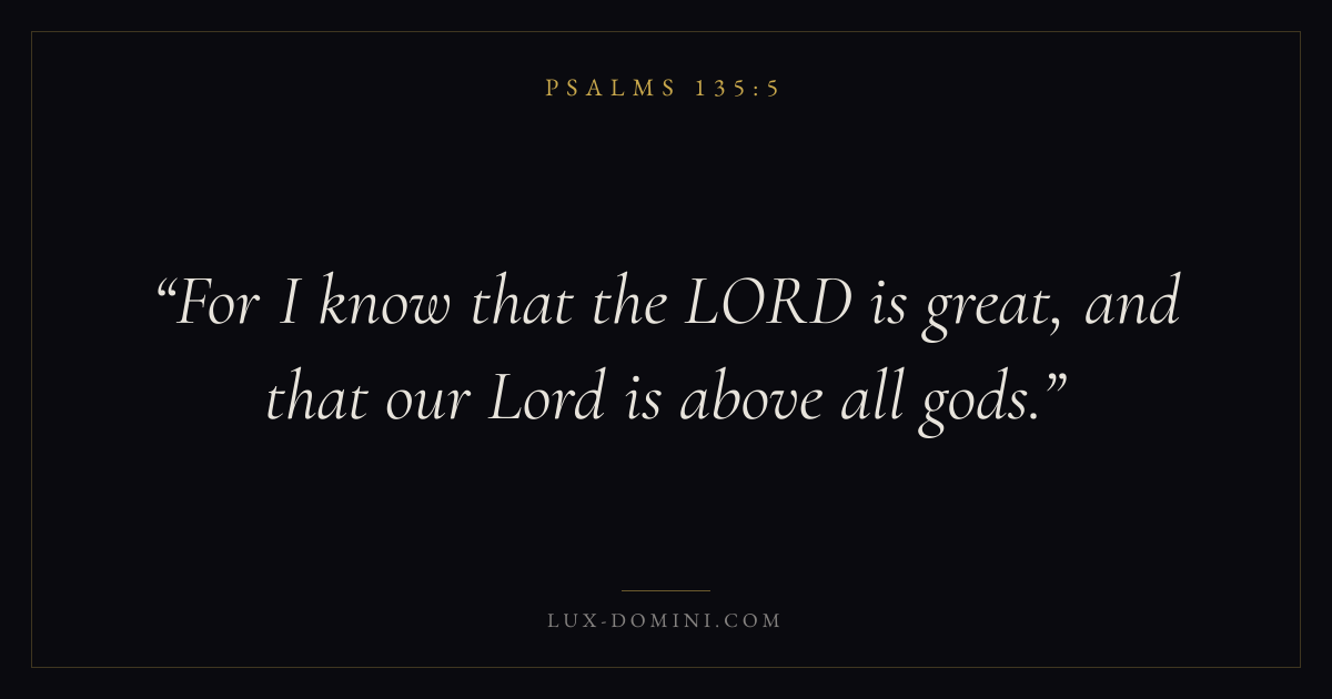 Books / Psalms / Chapter 135 / Verse 5 ← Psalms 135:4 Psalms 135:5 Psalms 135:6 → For I know that the LORD is great, and that our Lord is above all gods. Download verse card Share on Twitter Share on Facebook Pin it ✦ Key themes FaithPrayerGracePraise Read with Hebrews 11:1Romans 10:17Matthew 6:9Luke 18:1 Related topics Bible verses about faithBible verses about prayerBible verses about graceBible verses about thankfulness and gratitude ✦ Psalms Chapter 135 verses V. 1 V. 2 V. 3 V. 4 V. 5 V. 6 V. 7 V. 8 V. 9 V. 10 V. 11 V. 12 V. 13 V. 14 V. 15 V. 16 V. 17 V. 18 V. 19 V. 20 V. 21