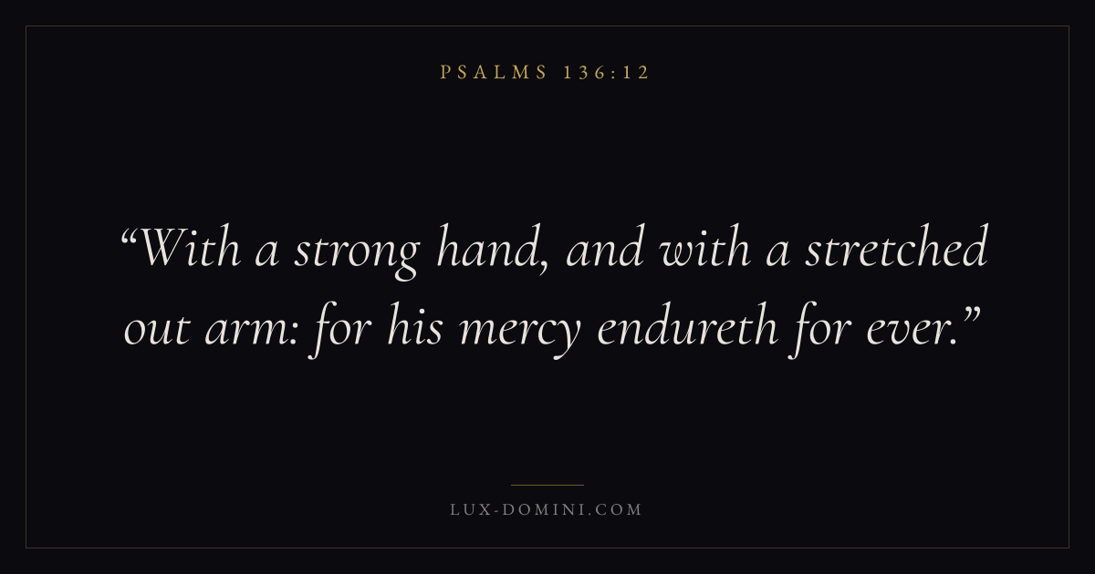 Books / Psalms / Chapter 136 / Verse 12 ← Psalms 136:11 Psalms 136:12 Psalms 136:13 → With a strong hand, and with a stretched out arm: for his mercy endureth for ever. Download verse card Share on Twitter Share on Facebook Pin it ✦ Key themes FaithPrayerJustice and mercyPraise Read with Hebrews 11:1Romans 10:17Matthew 6:9Luke 18:1 Related topics Bible verses about faithBible verses about prayerBible verses about justice and mercyBible verses about thankfulness and gratitude ✦ Psalms Chapter 136 verses V. 1 V. 2 V. 3 V. 4 V. 5 V. 6 V. 7 V. 8 V. 9 V. 10 V. 11 V. 12 V. 13 V. 14 V. 15 V. 16 V. 17 V. 18 V. 19 V. 20 V. 21 V. 22 V. 23 V. 24 V. 25 V. 26