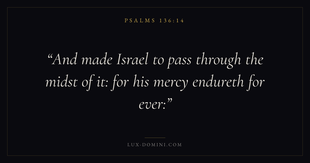 Books / Psalms / Chapter 136 / Verse 14 ← Psalms 136:13 Psalms 136:14 Psalms 136:15 → And made Israel to pass through the midst of it: for his mercy endureth for ever: Download verse card Share on Twitter Share on Facebook Pin it ✦ Key themes FaithPrayerJustice and mercyPraise Read with Hebrews 11:1Romans 10:17Matthew 6:9Luke 18:1 Related topics Bible verses about faithBible verses about prayerBible verses about justice and mercyBible verses about thankfulness and gratitude ✦ Psalms Chapter 136 verses V. 1 V. 2 V. 3 V. 4 V. 5 V. 6 V. 7 V. 8 V. 9 V. 10 V. 11 V. 12 V. 13 V. 14 V. 15 V. 16 V. 17 V. 18 V. 19 V. 20 V. 21 V. 22 V. 23 V. 24 V. 25 V. 26